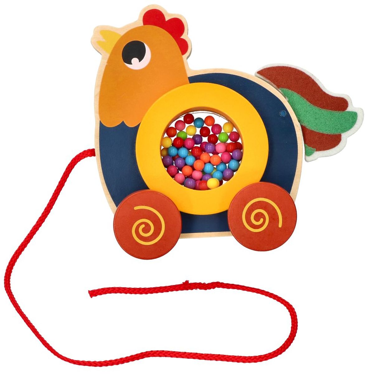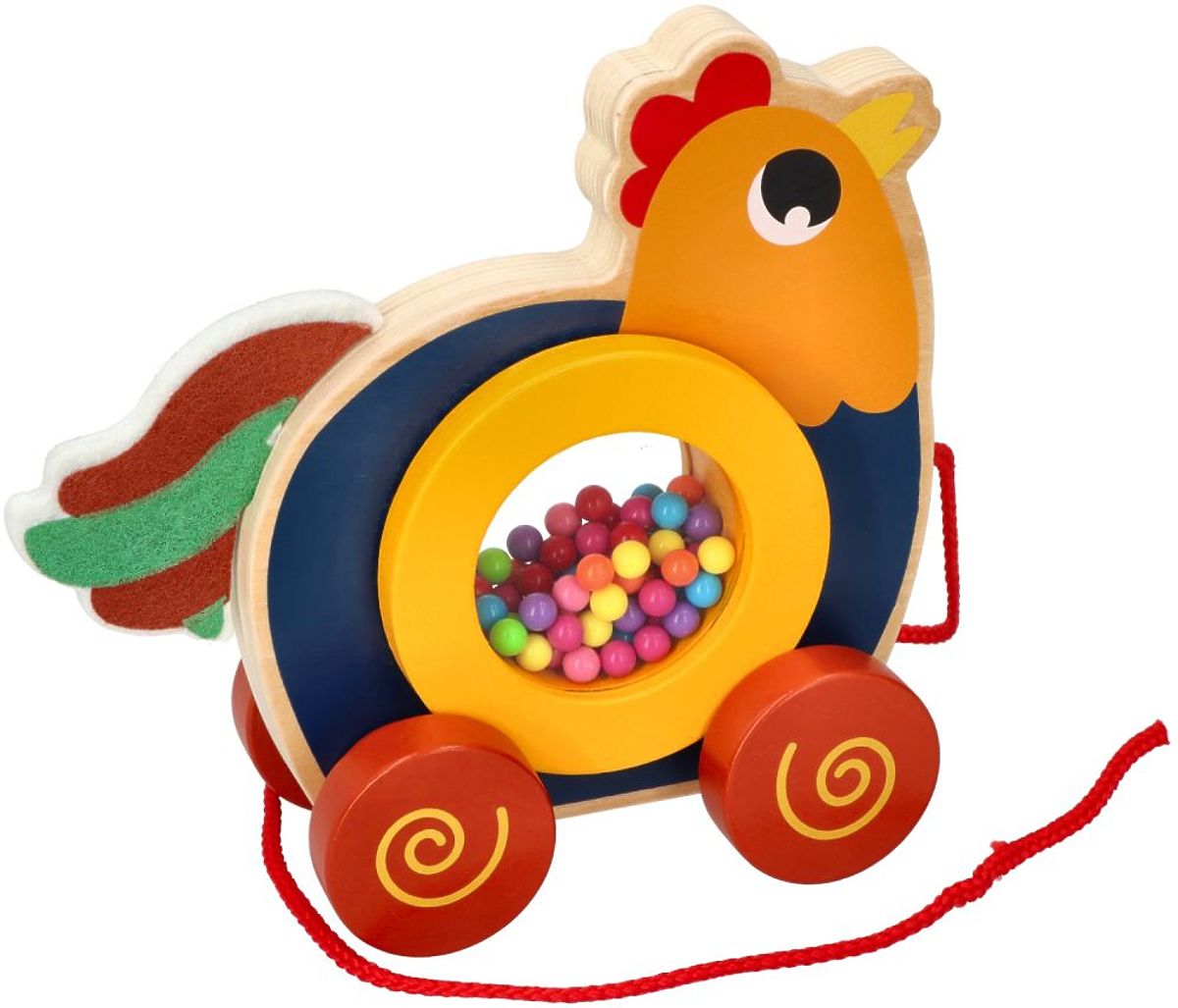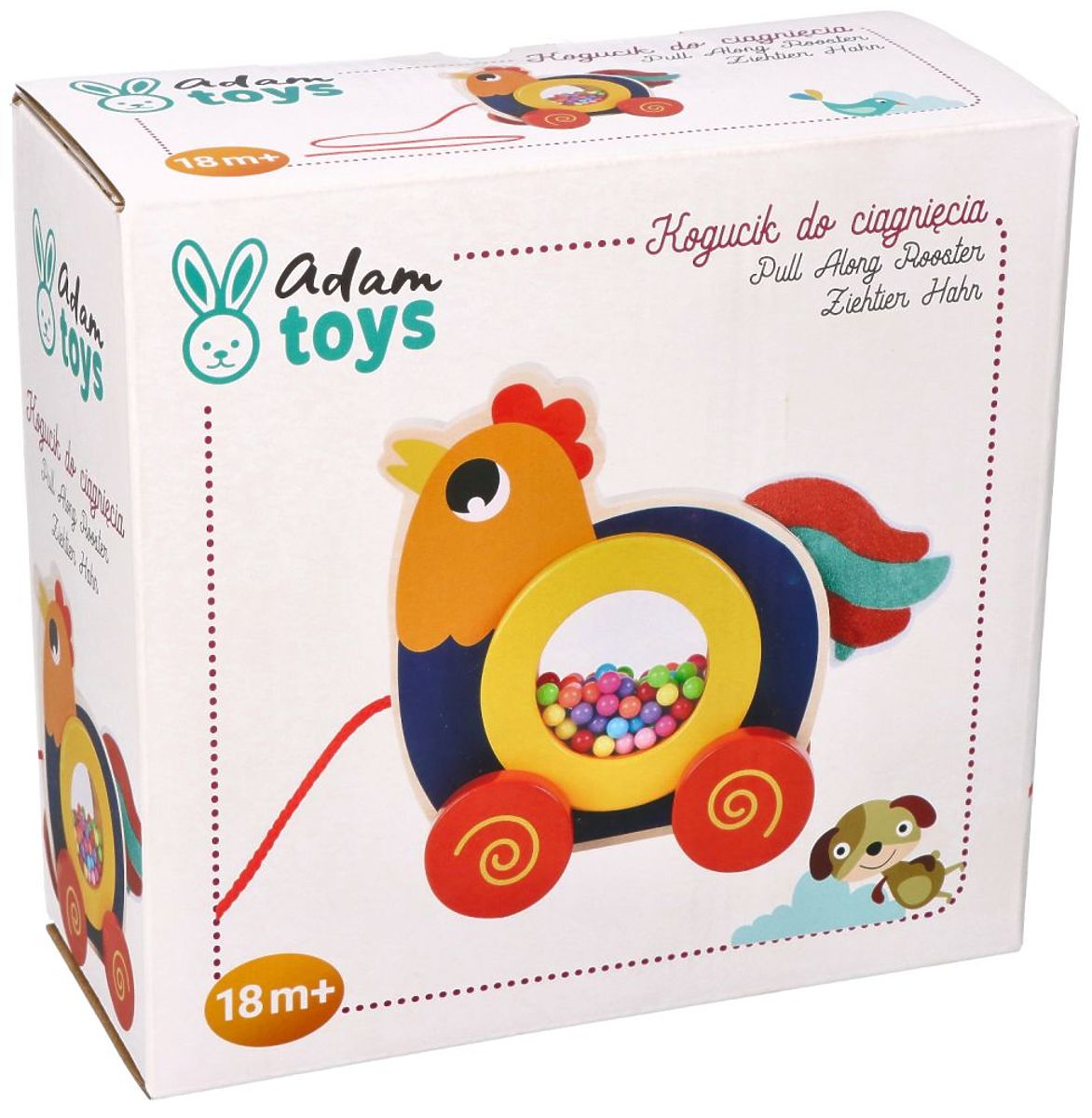 Kukurykuuuuu!!! Z diaľky je počuť hlasné kikiríkanie. Určite celá farma už nespí vďaka spoľahlivému Kohútovi :) Tento roztomilý Kohútik pozýva dieťa k spoločnej hre. Táto hračka určite spríjemní každú spoločnú prechádzku vďaka farebným guľôčkam, ktoré sa pri ťahaní točia. Čím rýchlejšie tempo prechádzky, tým rýchlejšie sa guľôčky otáčajú. Robí dojem :D