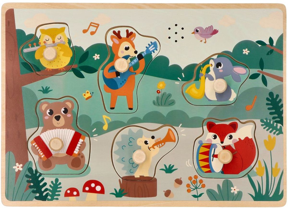 Ďalšia zvuková ponuka od Adam Toys vedľa skladačky farma a safari. Tentokrát sa zoznámime nielen so zvieratami z lesa, ale aj so zvukmi rôznych nástrojov. Úlohou je samozrejme prispôsobiť tvar zvieratka správnemu miestu na skladačke. Ak to urobí správne, ako odmenu počuje zvuk nástroja, na ktorý hrá každé zo zvieratiek. Táto vzdelávacia hračka skvele rozvíja detskú predstavivosť, učí koncentrácii a pozorovacím schopnostiam. Dieťa si tiež precvičuje manuálne zručnosti, najmä prstíky, a zvuk ho navyše povzbudzuje k hre.