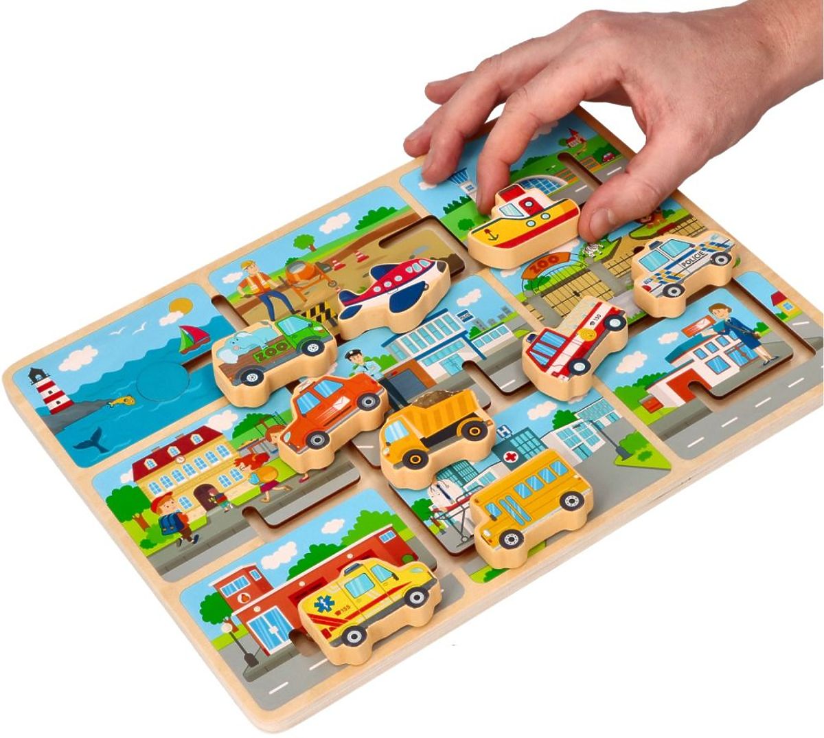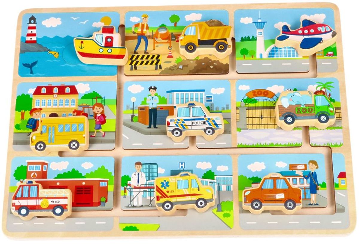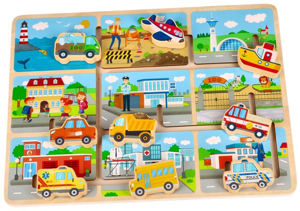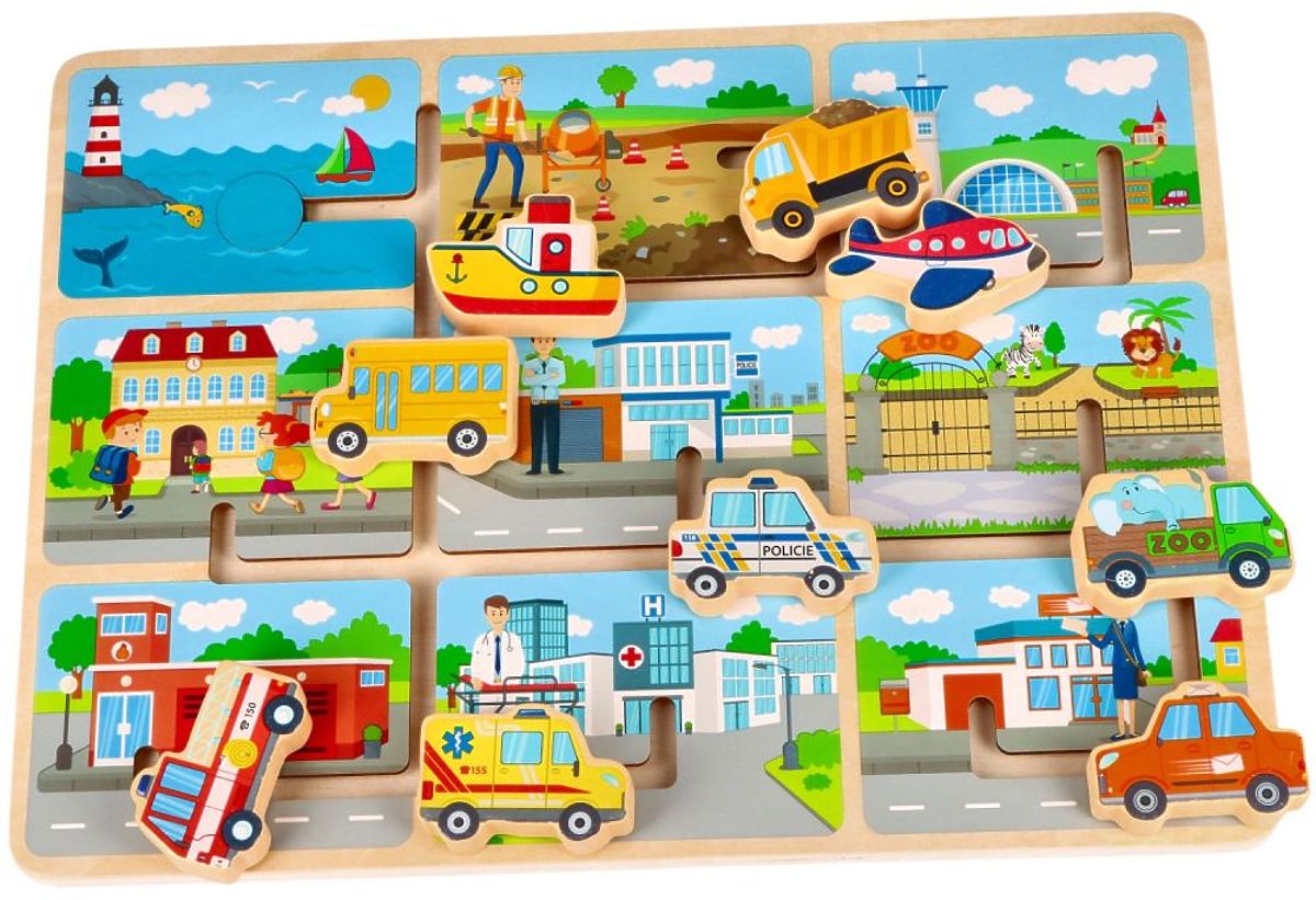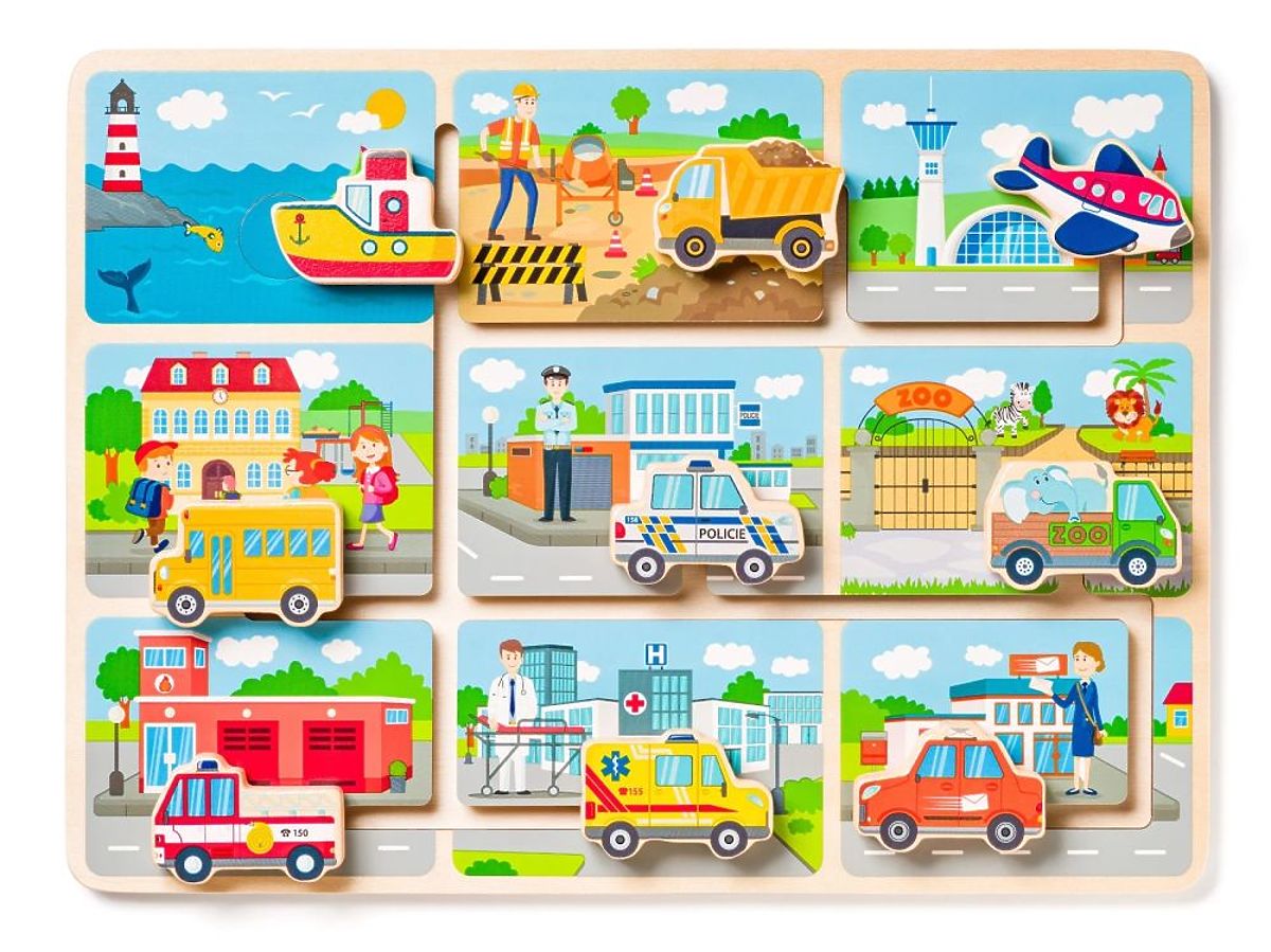 Skladačka je vyrobená z dreva. Na drevenej základni je bludisko a 9 vozidiel, ktoré je potrebné zaparkovať pod zodpovedajúcu budovu. Nájdete tu napr.: loď, lietadlo, nákladné auto alebo sanitku.