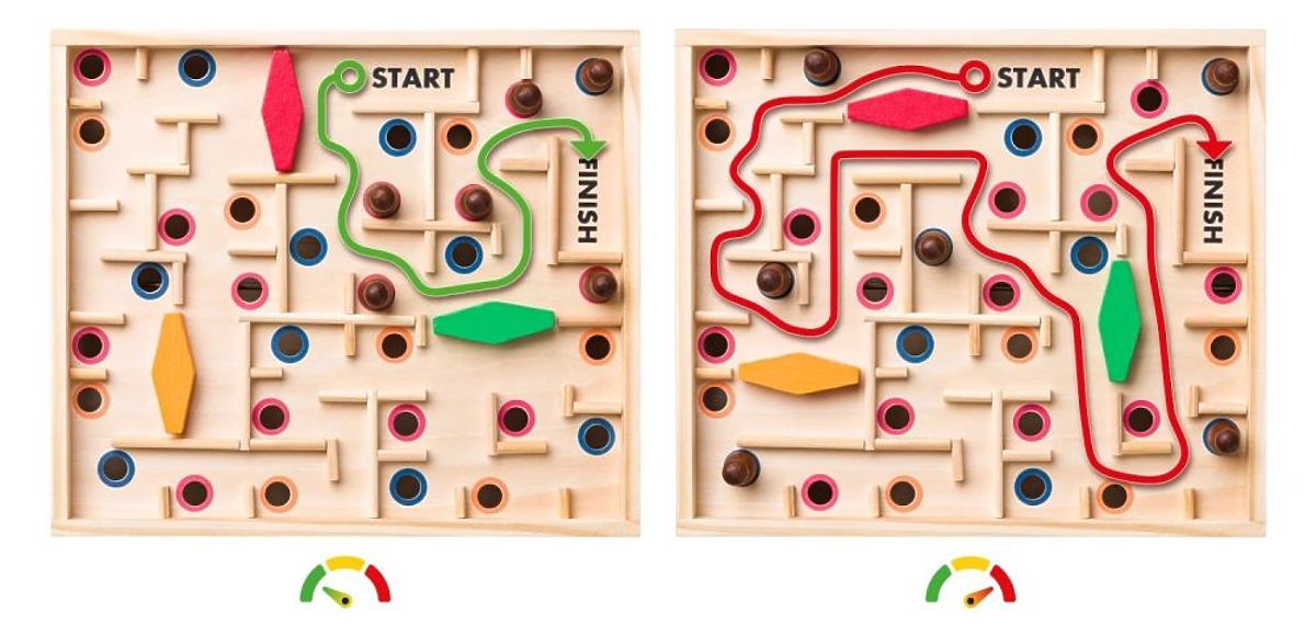 Princíp fungovania je veľmi jednoduchý - je potrebné doviesť guľôčku od štartovacieho poľa označeného nápisom "START" k cieľovému poľu označenému nápisom "FINISH". A tým končí jednoduchosť tejto zábavnej hry, pretože guľôčka sa veľmi hladko pohybuje labyrintom a ľahko spadne do dierky - a tomu je potrebné sa vyhnúť. Po celej dĺžke labyrintu sú rozmiestnené dierky. Často sú to rohové miesta alebo miesta, kde bude vyžadovaný manéver, čo hru ešte viac sťažuje. Našťastie je v sade sada 6 figúrok, ktorými môžete upchať "najnenávidenejšie" dierky alebo akékoľvek iné. Počet použitých figúrok je ľubovoľný, počas prvých hier môžete použiť všetky alebo väčší počet. Akonáhle získate skúsenosti, môžete postupne znižovať počet figúrok alebo ich úplne eliminovať a zaviesť novú úroveň hry "hardcore" :)