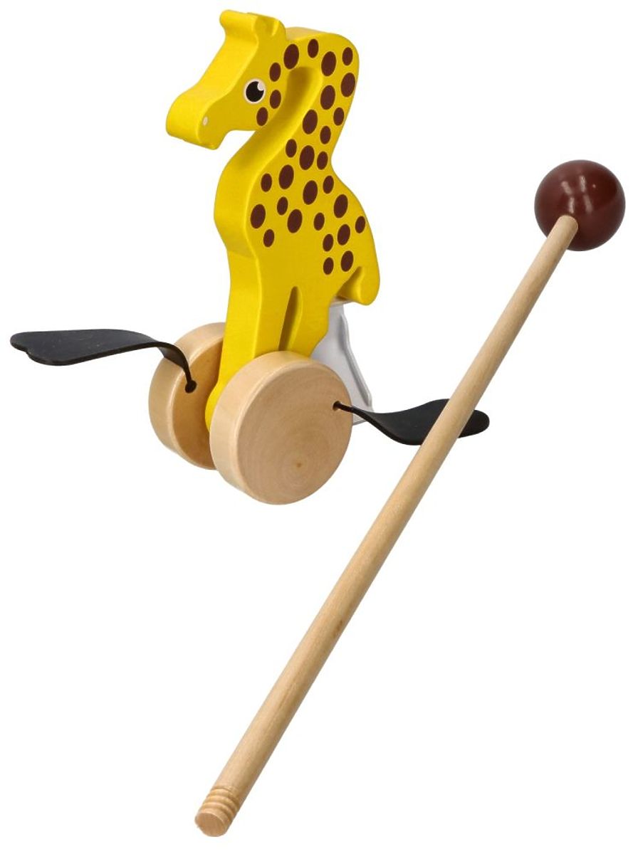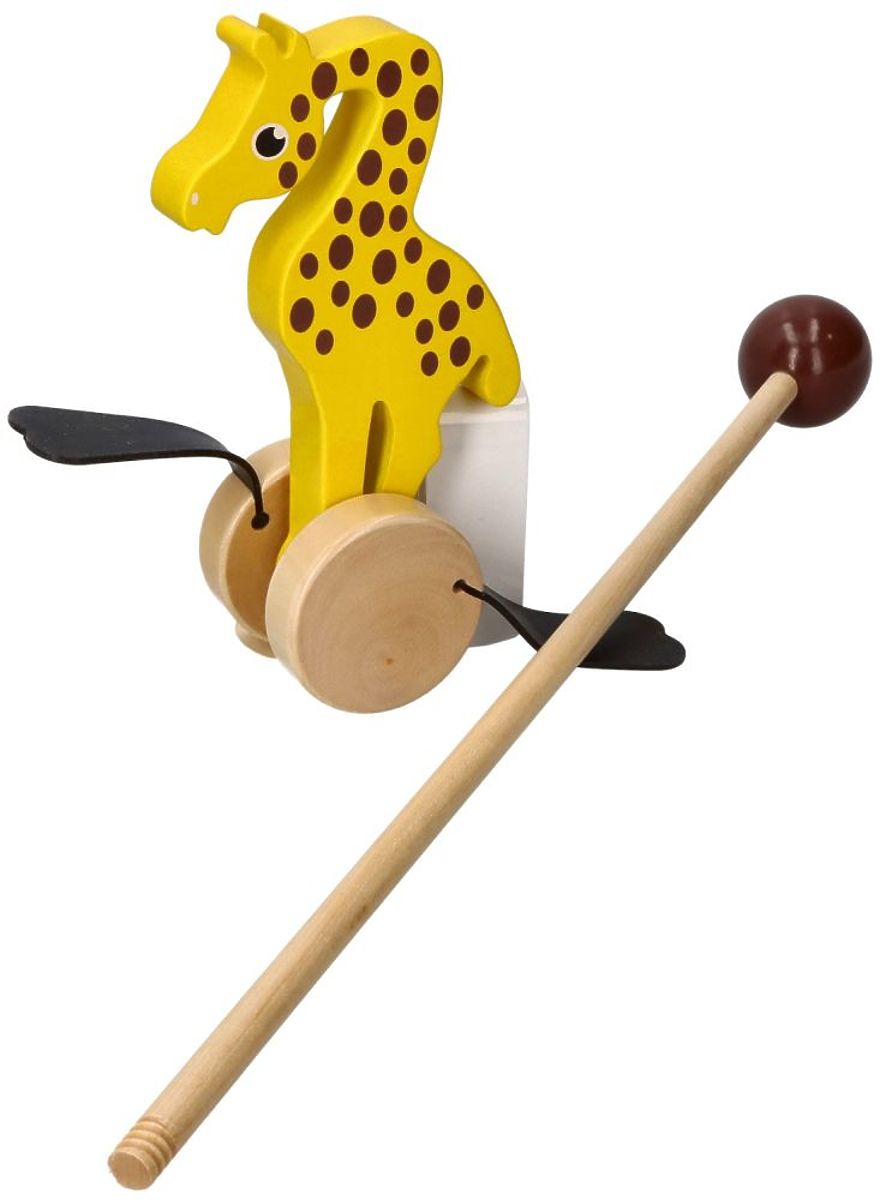 Predstavujeme ideálneho spoločníka na spoločné prechádzky. Roztomilá Žirafa z dreva je hračka, ktorá bude motivovať dieťa k pohybu a chôdzi. Dieťa uchopí tyč a tlačí zvieratko pred sebou. Kolesá pri otáčaní spôsobia plácanie gumových prvkov o zem. Tyč je zakončená rukoväťou pre pohodlné tlačenie hračky. Tyč je skrutkovacia.