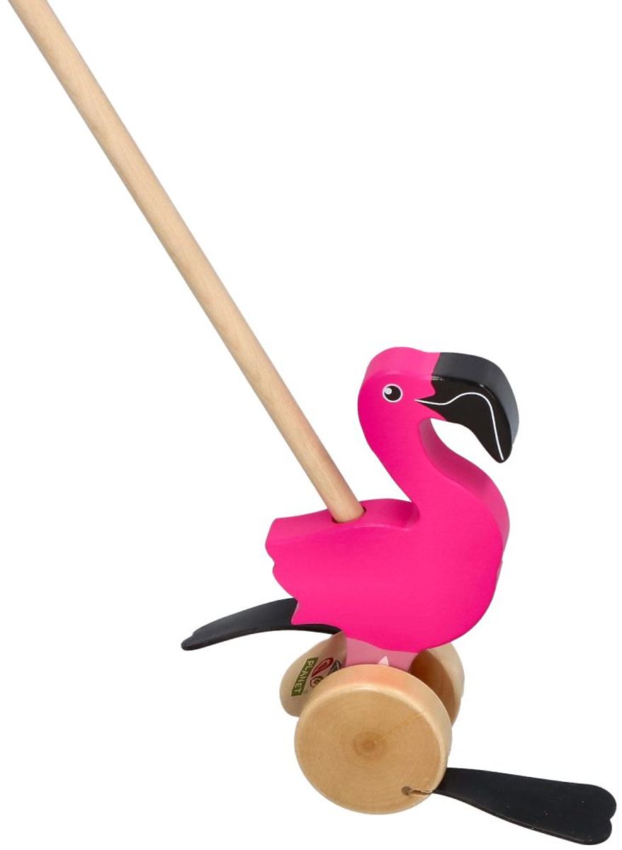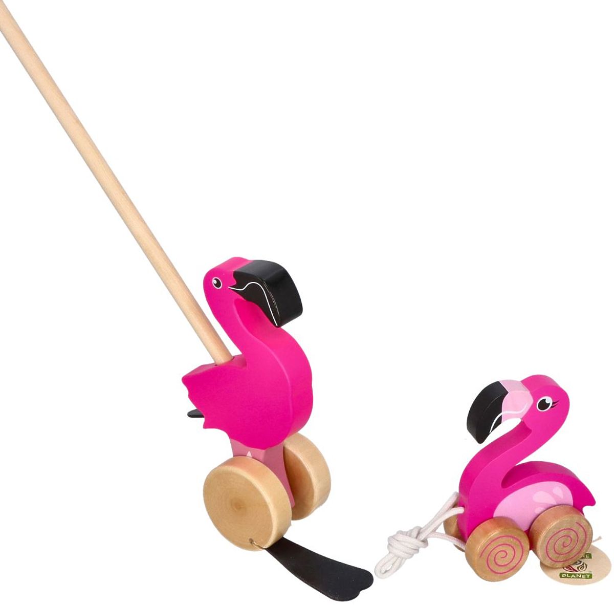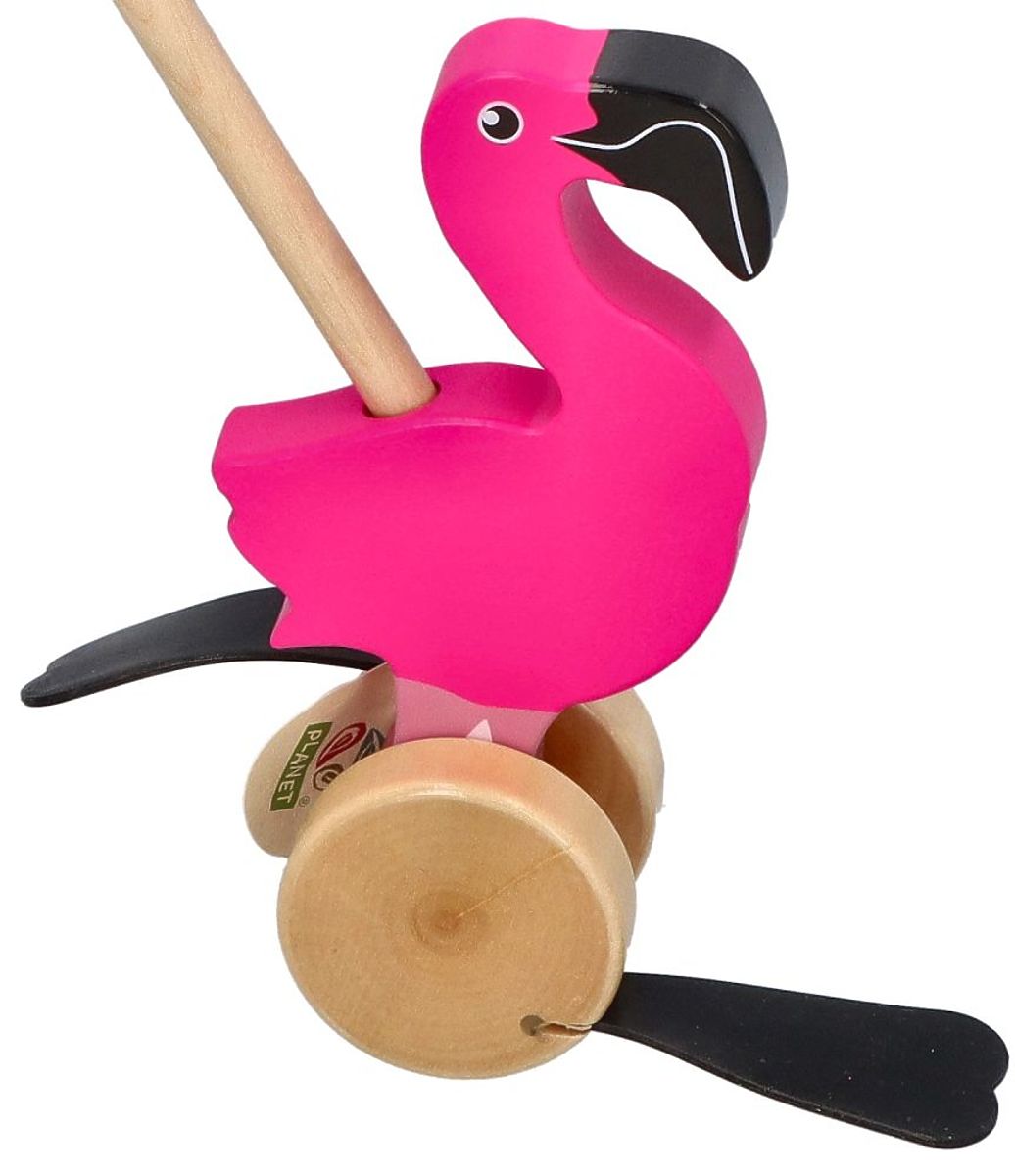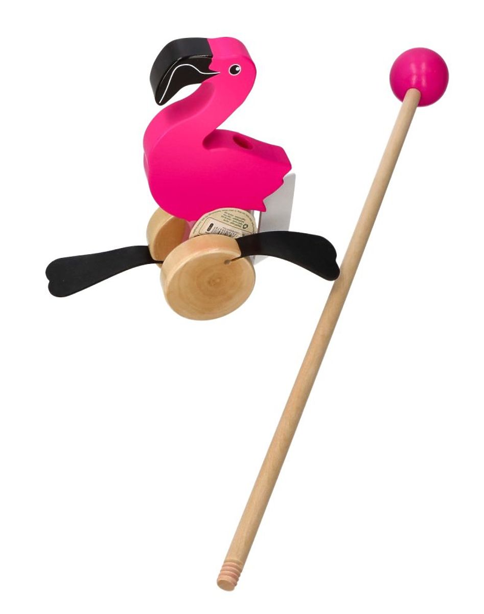 Predstavujeme ideálneho spoločníka na spoločné prechádzky. Očarujúci ružový Plameniak z dreva je hračka, ktorá bude povzbudzovať dieťa k pohybu a chôdzi. Dieťa uchopí tyč a tlačí vtáčika pred sebou. Kolesá pri otáčaní spôsobujú plácanie gumových prvkov o zem. Tyč je zakončená rukoväťou, aby bolo pohodlné tlačiť hračku. Tyč je priskrutkovaná.