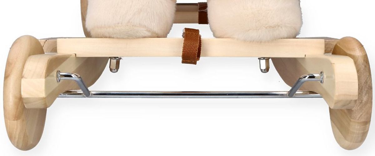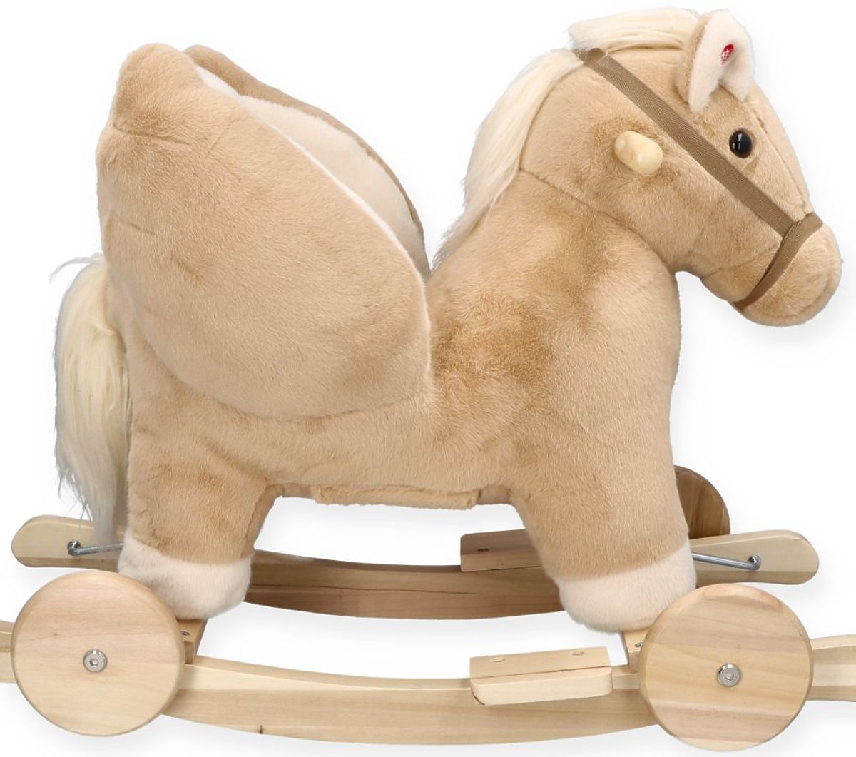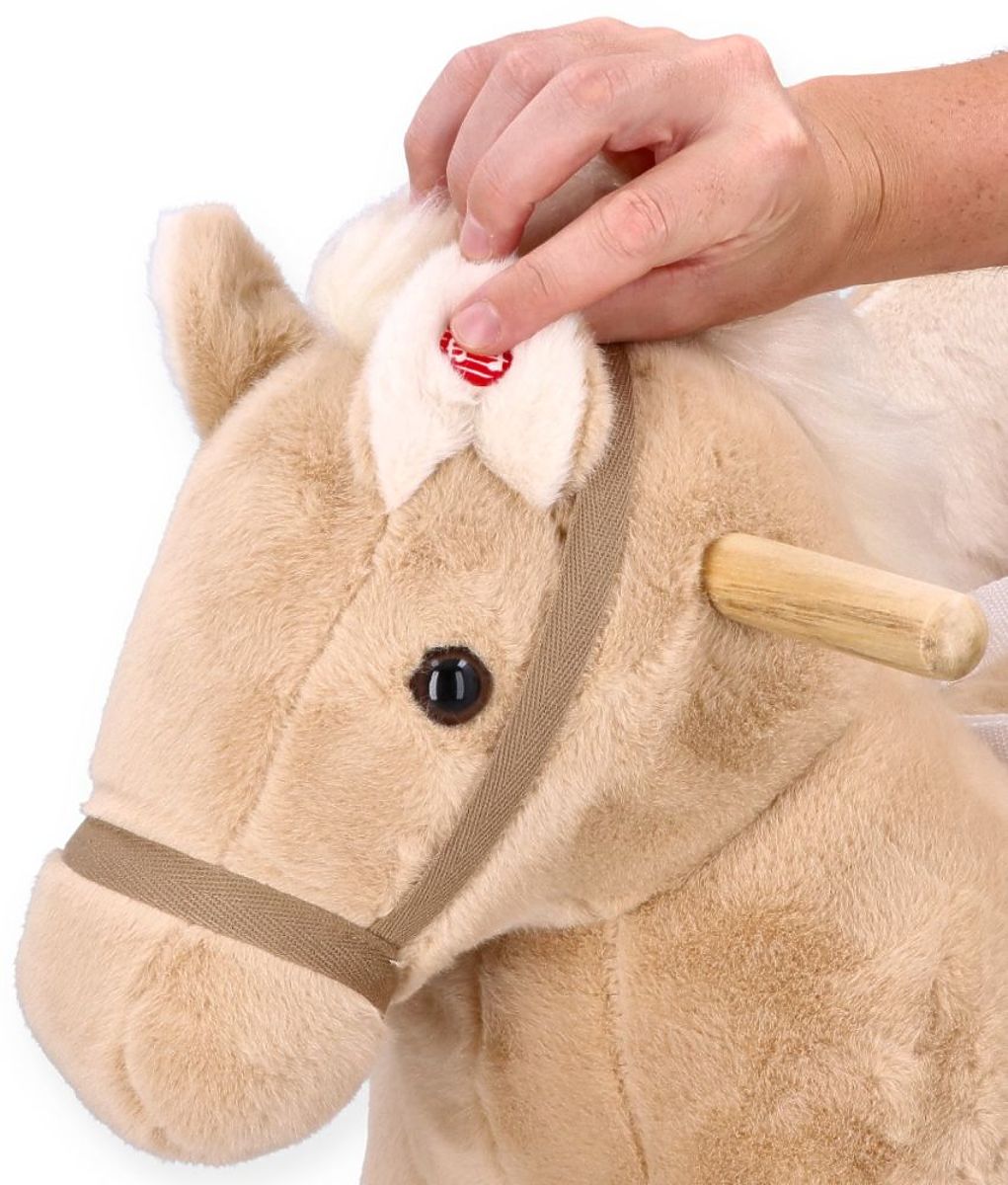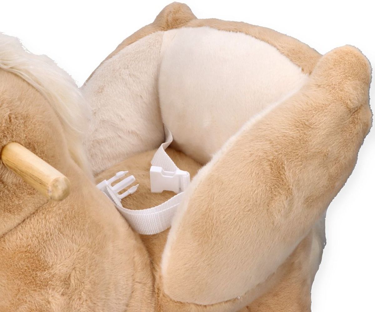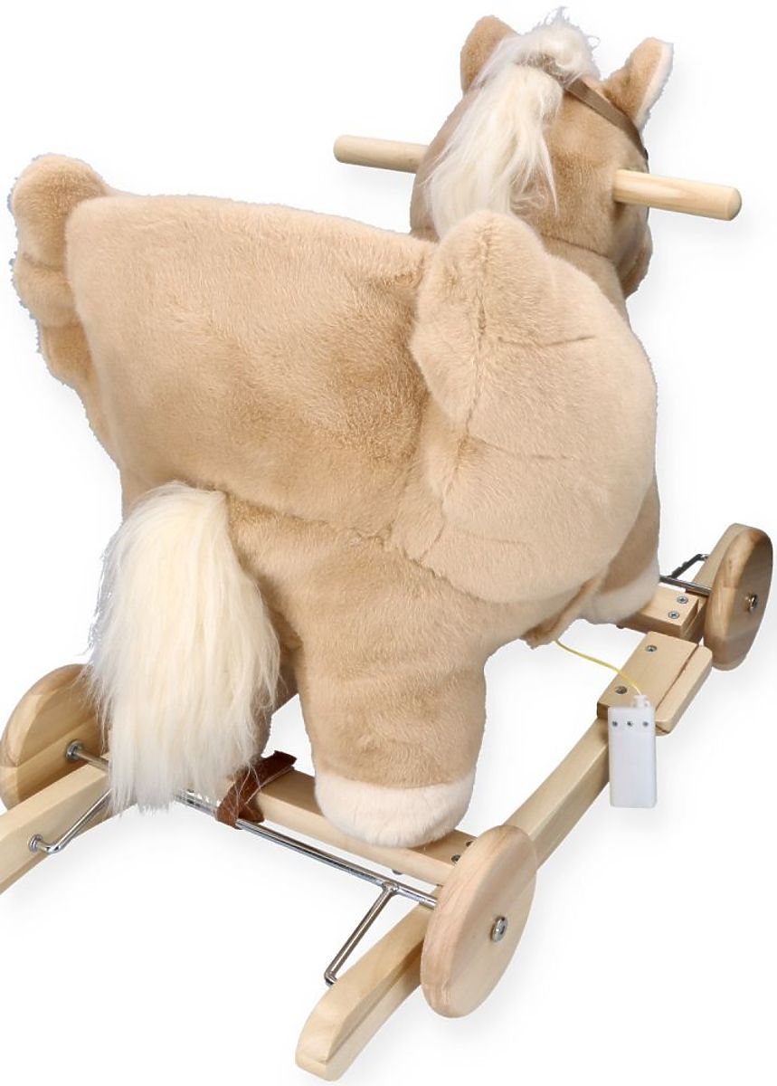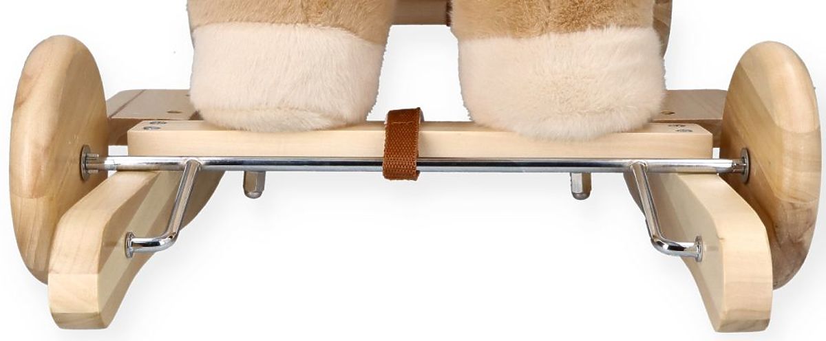 Pegas je vyrobený z mäkkého a jemného na dotyk plyšového materiálu v jemnej béžovej farbe. Lyžiny a držadlá sú vyrobené z dreva v prírodnej farbe, čo sa dokonale hodí k celkovému konceptu. Náš plyšový priateľ má drevené kolesá, ktoré umožňujú, že v závislosti na ich usporiadaní môže byť hojdadlom alebo odrážadlom. Premena z odrážadla na hojdadlo je veľmi jednoduchá. Nie je potrebné nič demontovať, stačí rozopnúť špeciálny pásik a otočiť kolieska na druhú stranu lyžín. Hotovo!