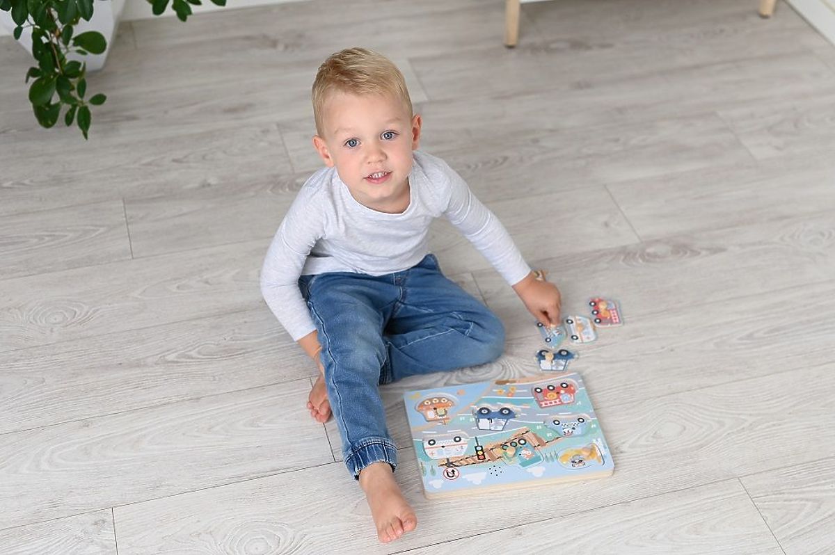 Opäť hudobné puzzle? Tých nikdy nie je dosť! Tentokrát zvukové puzzle značky Adam Toys, čo je ďalší návrh tejto firmy - hneď vedľa skladačiek s motívom farmy, safari alebo nástrojov. Tentokrát spoznáme našich lesných priateľov za volantom rôznych dopravných prostriedkov. Úlohou je samozrejme prispôsobiť tvar zvieratka na správne miesto na skladačke. Ak to dieťa urobí správne, ako odmenu počuje zvuk stroja, v ktorom sa zvieratko nachádza, napr.: líška rušňovodič, pilot mýval alebo hasič medveď :)