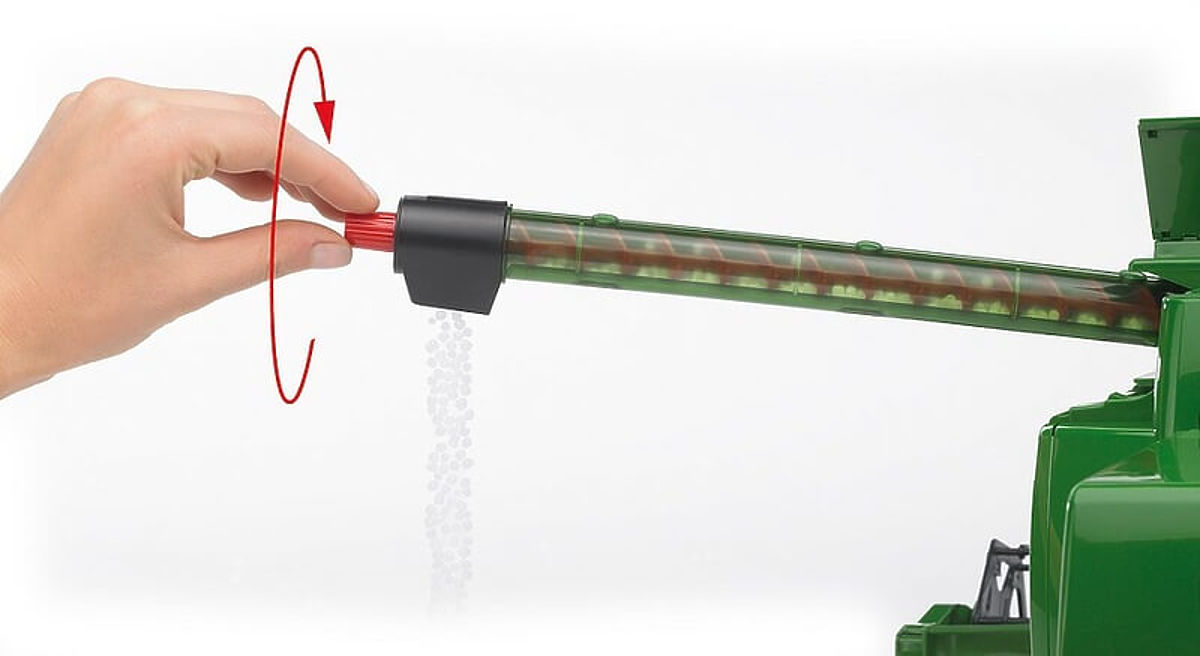 Tento kombajn Bruder má množstvo funkčných prvkov ako napríklad otváracie dvierka, výklopné zrkadlá, otočné schody do kabíny kombajnu, otočnú žaciu lištu, zatáčacie zadné kolesá, výklopné horné a bočné kryty, výklopné rameno. Šnek v ramene imituje sypanie obilia. Materiál je vhodný na hranie doma aj vonku. Vyrobené v Nemecku. Hlavné vlastnosti: množstvo funkčných prvkovvhodné von aj dovnútravyrobené v Nemecku