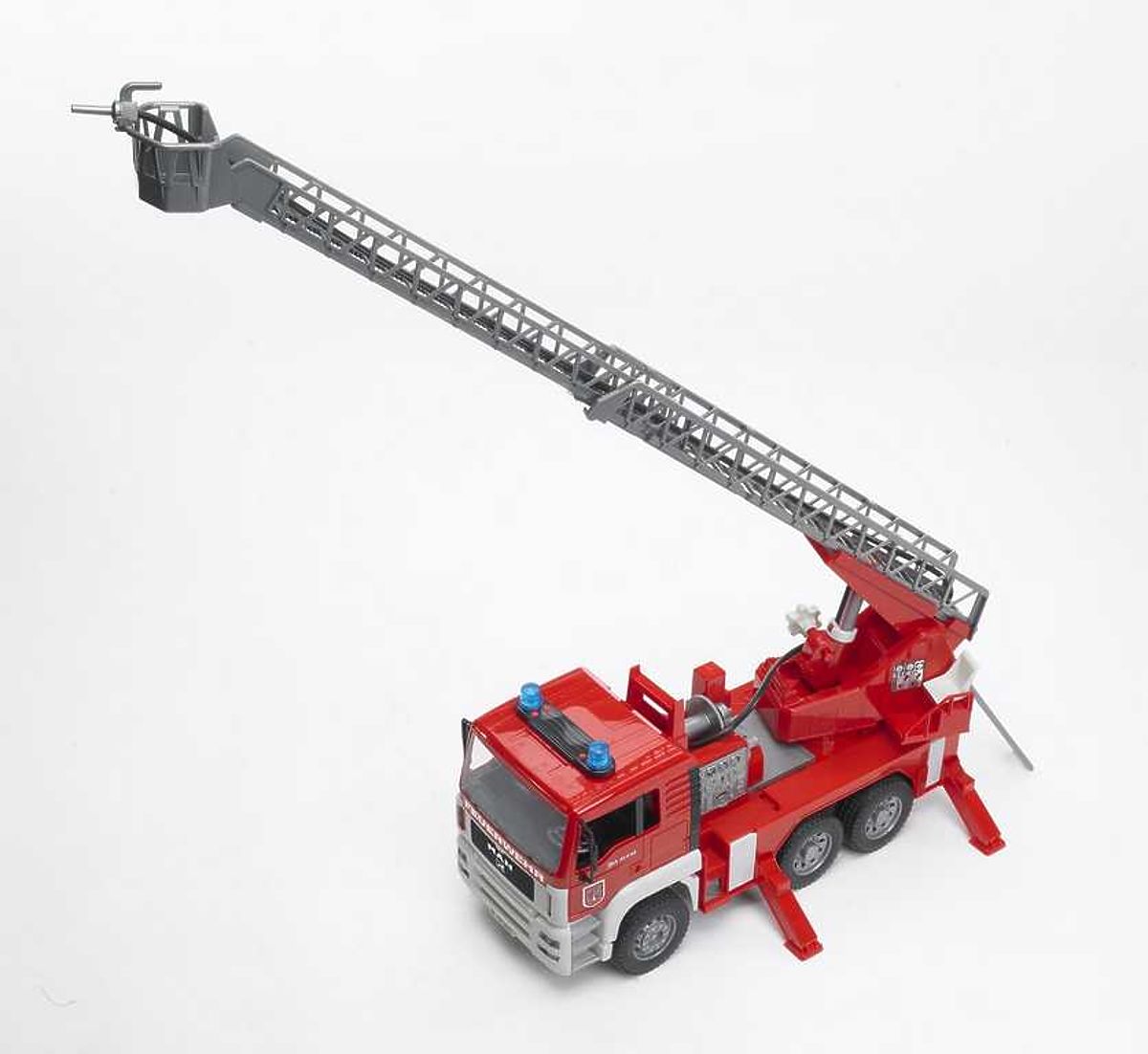Bruder MAN TGA Hasiči so striekačkou je prepracovaný model vozidla s pevnými profilovanými pneumatikami, má plne sklopnú kabínu, je možné nahliadnuť na blok motora, je vybavené plne funkčnou vodnou pumpou a striekačkou a predovšetkým rozmerným výsuvným rebríkom. Rameno rebríka možno vysunúť do dĺžky až 80 cm! Plošina s výsuvným rebríkom je otočná, zrkadlá pri kabíne sa dajú sklopiť a integrovanú nádrž na vodu je možné jednoducho naplniť. Štyri oporné bloky zabezpečujú dokonalú stabilitu pre celé vozidlo aj s vysunutým rebríkom. Zaujímavosťou na tomto vozidle je moderný multifunkčný modul so svetlom a zvukom. Vyrobené v Nemecku, z kvalitných materiálov. Hlavné vlastnosti: plne sklopná kabína plne funkčná vodná pumpa a striekačka rozmerný výsuvný rebrík do dĺžky až 80 cm otočná plošina s výsuvným rebríkom sklopné zrkadlá moderný multifunkčný modul so svetlom a zvukom vyrobené v Nemecku