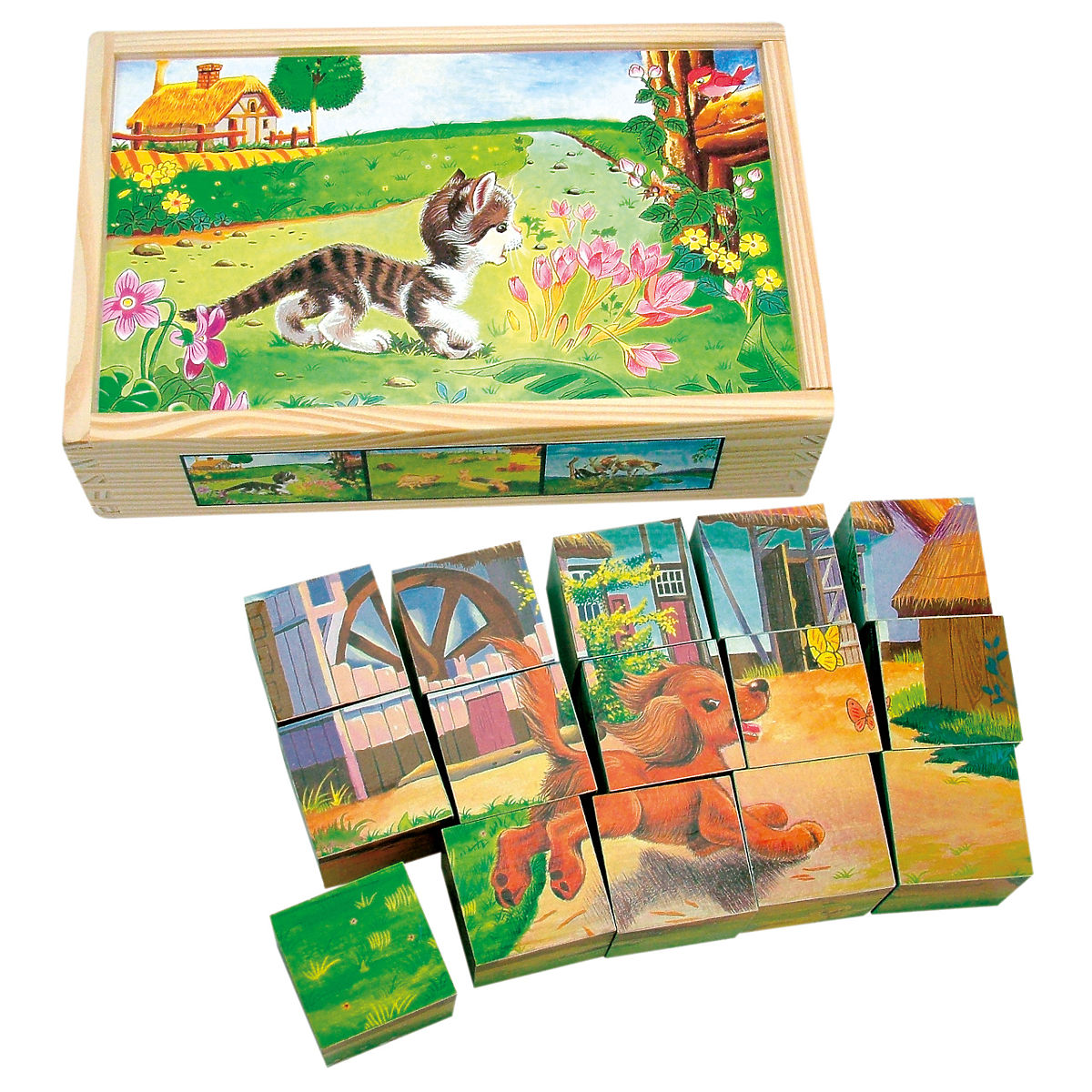 Niet nad najklasickejšiu z hračiek, obrázkové kocky. Potlačené výjavy zo života na dedine s domácimi a hospodárskymi zvieratkami. Kocky sú vyrobené z masívneho dreva a balené v praktickej krabičke z preglejky. Hlavné vlastnosti: krabička s vekom a 15 kociek, 6 rôznych obrázkov, praktické balenie