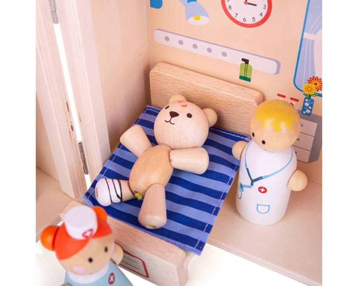 Pán Medveď sa udrel do hlavy! Táto pestrofarebná drevená mini nemocničná herná sada má vo vnútri aj zvonku funkčné prvky a je dodávaná s nemocničným lôžkom, lekárskou infúziou, monitorom srdca, medveďom, sestričkou a lekárom. Rukoväť a bezpečná spona zabezpečujú, že táto sada je vždy pripravená cestovať s vaším malým dieťaťom a zároveň sú všetky herné prvky bezpečne uložené vo vnútri. Vyrobené z vysoko kvalitných, zodpovedne získaných materiálov. Spĺňa aktuálne európske bezpečnostné normy. Obsahuje 9 herných prvkov. Hlavné vlastnosti: kompaktná uzatvárateľná mini nemocnica obsahuje 9 herných prvkov vyrobené z vysoko kvalitných, zodpovedne získaných materiálov spĺňa aktuálne európske bezpečnostné normy