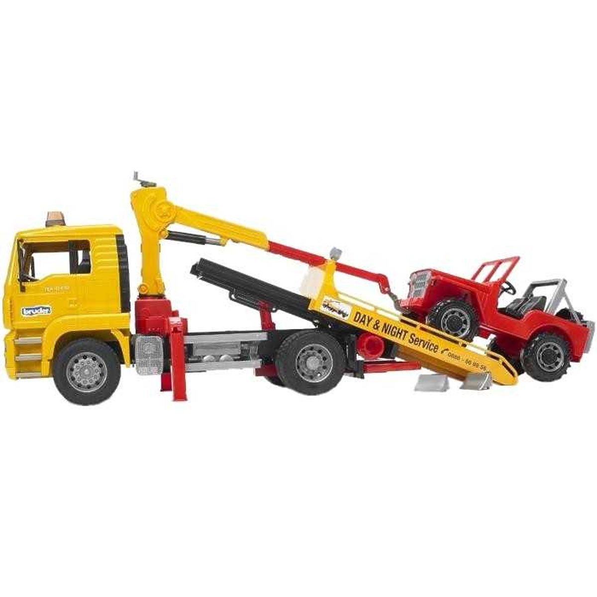 Bruder Nákladné auto MAN odťah + JeepOdťahová služba + Jeep je odťahové vozidlo vrátane jeepu. Odťahové vozidlo MAN TGA má sklopnú kabínu, je možné nahliadnuť na blok motora a predné sklo vyrobené z vysoko odolného nerozbitného polykarbonátu. Za kabínou je umiestnená funkčná otočná manipulačná ruka, ktorá sa dá vysunúť a jej súčasťou sú reťaze s úchytnými segmentmi pre jednoduchú manipuláciu s jeepom. Nástavba má podkladové kliny a výklopné opory pre 100% stabilitu plne naloženého odťahového vozidla. Terénny Jeep má otvárateľnú kapotu motora, predný čel sa dá sklopiť a má veľmi jednoduché osové riadenie. Na odťahové vozidlo je možné dokúpiť a nainštalovať svetelný a zvukový maják (BR2801) a tiež prednú radlicu (BR2775). Vyrobené v Nemecku, z kvalitných materiálov. Hlavné vlastnosti: nákladné auto s Jeepom, sklopná kabína, otvárateľná kapota motora, sklopný predný čel, otočná manipulačná ruka, vyrobené v Nemecku
