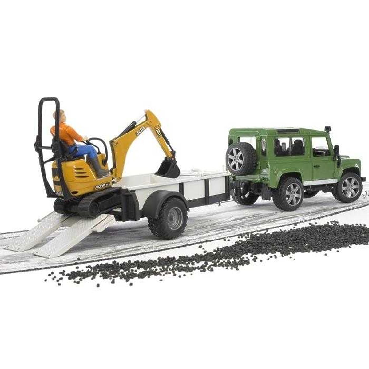 Land Rover je zelené terénne dvojnápravové vozidlo s otvárateľným motorovým priestorom, s detailným spracovaním pohonnej jednotky, otváraním dverí, zadných dverí aj nákladného priestoru. Má odpružené obe nápravy, odnímateľné závesné zariadenie, strešný nosič a funkčné riadenie. Vozidlo je možné ovládať buď klasickým volantom na mieste vodiča, alebo je možné použiť predĺžený volant a zasunúť ho do adaptéra v stredovom paneli Land Roveru po otvorení strešného okna, čo uľahčí ovládanie vozidla. Predĺžený volant je súčasťou vozidla a je umiestnený v podvozku. Súčasťou tohto modelu je príves so sklopnými nájazdmi na prepravu techniky. Sada obsahuje figúrku muža a minibager JCB, čo je pásový minibager s otočnou kabínou a funkčným ramenom s lyžicou. Minibager je kompatibilný s figúrkami Bworld. Rovnako ako všetky vozidlá BRUDER, aj tento model bol inšpirovaný detailmi originálu. Hlavné vlastnosti: otvárateľná kapota a strešné okno, detailné spracovanie nákladného priestoru, odpružené obe nápravy, strešný nosič, súčasťou balenia je predĺžený volant, príves so sklopnými nájazdmi, figúrka muža s minibagrom, minibager je s otočnou kabínou a funkčným ramenom s lyžicou, minibager je kompatibilný s figúrkami Bworld