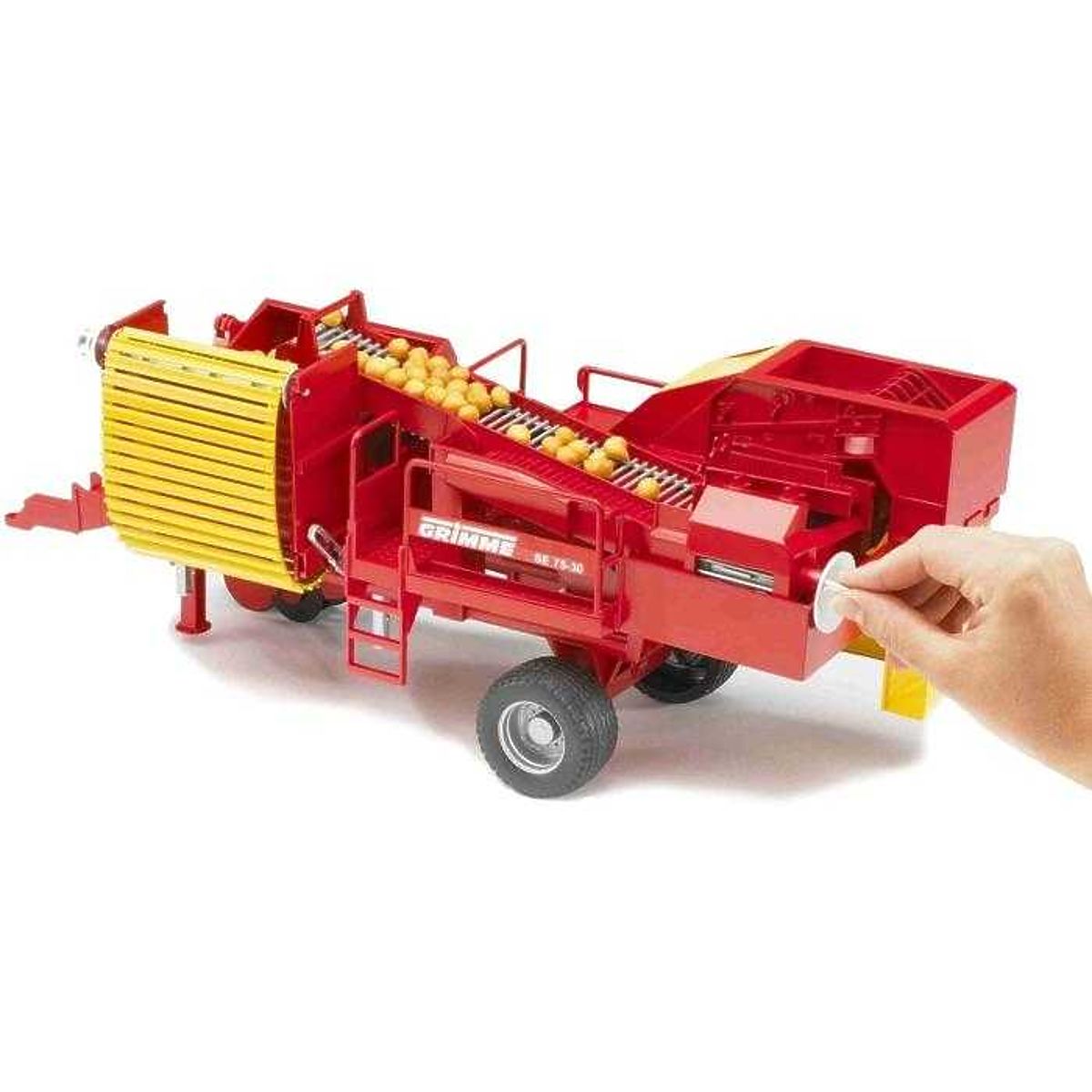 Kombajn na zemiaky je veľký a detailne prepracovaný model kombajnu. Najdôležitejšou časťou je preberací pás, ktorý sa ľahko ovláda pomocou ručnej kľučky. Zo pásu sú zemiaky transportované priamo do zásobníka, ktorý je možné podľa želania nastaviť. Stabilitu vozidla zabezpečuje sklopná oporná noha, vynášací pás je možné skladať a kombajn má profilované pneumatiky. Môže sa pripojiť k ľubovoľnému traktoru BRUDER série 20xx, 21xx a 30xx. V príslušenstve nájdeme 80 ks zemiakov do stroja. Veľkosť zemiakov je cca 5-8 mm. Vyrobené v Nemecku, z kvalitných materiálov. Hlavné vlastnosti: preberací pás ovládaný ručnou kľučkou, sklopný pás, kompatibilný s traktormi Bruder, 80 ks zemiakov, vyrobené v Nemecku