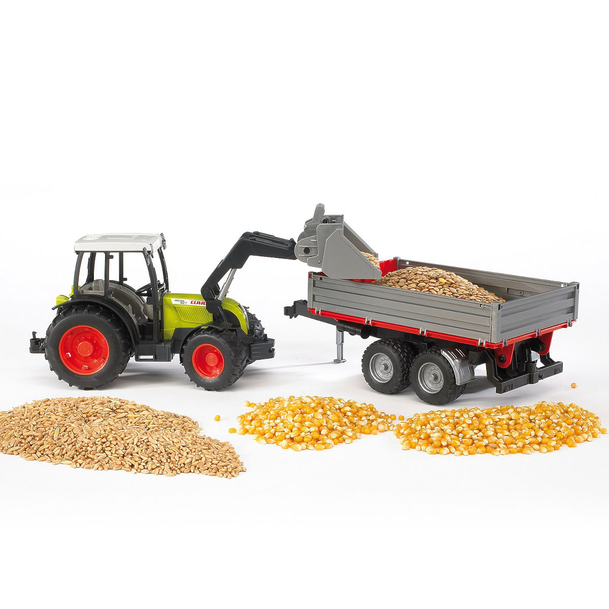 Tento model Class zo série Nectis s prívesom a predným nakladačom je nepostrádateľným pomocníkom najmä na poli. Vďaka pevným profilovým pneumatikám je traktor ľahko ovládateľný a manévrovateľný aj v náročnejších pôdnych podmienkach. Tento model je vybavený plne funkčným čelným nakladačom, ktorý je možné ľahko odňať, má otvárateľný motorový priestor, zasklenú kabínu, funkčné riadenie - súčasťou je druhý volant s dlhším ramenom, ktorý sa zasunie do existujúceho volantu v kabíne strešným výsuvným otvorom a tým veľmi uľahčí ovládanie stroja. Súčasťou tohto setu je Bruder sklápač červený príves, ktorý je naozaj vernou kópiou dvojosového prívesu. Má otváracie bočné aj zadné bočnice a sklopnú ložnú plochu. Vyrobené v Nemecku, z kvalitných materiálov. Hlavné vlastnosti: pevné profilované pneumatiky, plne funkčný čelný nakladač, otvárateľný kryt motora, zasklená kabína, druhý volant pre ľahké riadenie, dvojosový sklápač s bočnými aj zadnými bočnicami a sklopnou ložnou plochou, vyrobené v Nemecku
