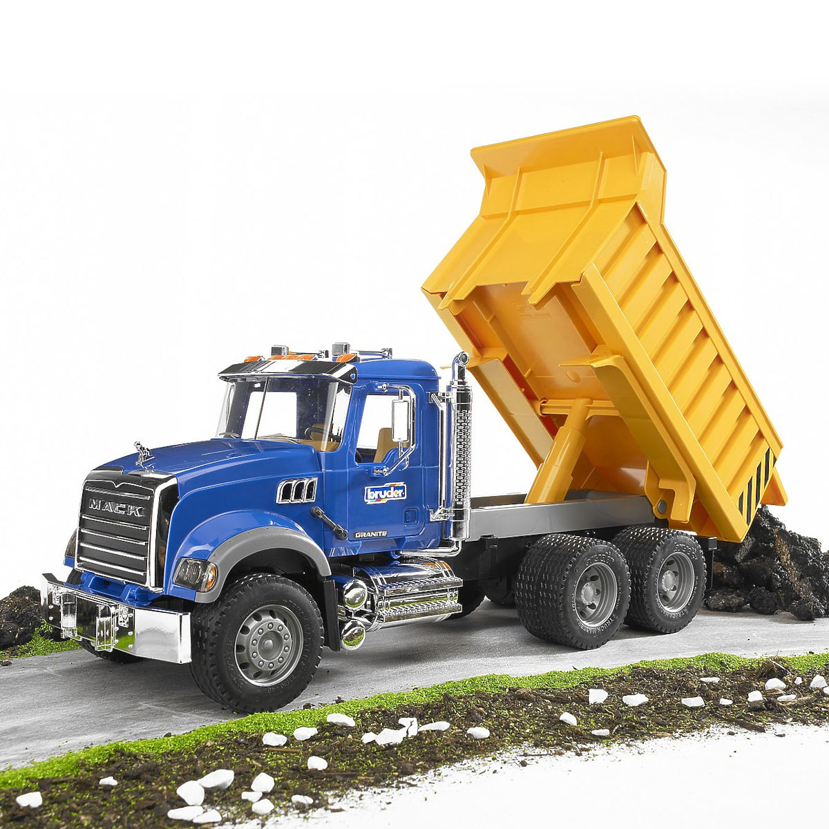 Bruder Nákladné auto MACK Granit sklápač. Model amerického vozidla MACK Granite s chrómovými doplnkami má sklopnú prednú kapotu s možnosťou nahliadnutia na blok motora, sklopné vonkajšie zrkadlá, predné sklo vyrobené z vysoko odolného polykarbonátu, otvárateľné dvere. Nechýbajú ani spätné zrkadlá, nárazník, výfuk a svetlá na streche. Sklápacia korba je ľahko ovládateľná pomocou hydrauliky a zadnú stenu je možné otvoriť. Vyrobené v Nemecku, z kvalitných materiálov. Hlavné vlastnosti: výklopný kryt motora, sklopné vonkajšie zrkadlá, otvárateľné dvere, vyrobené v Nemecku.