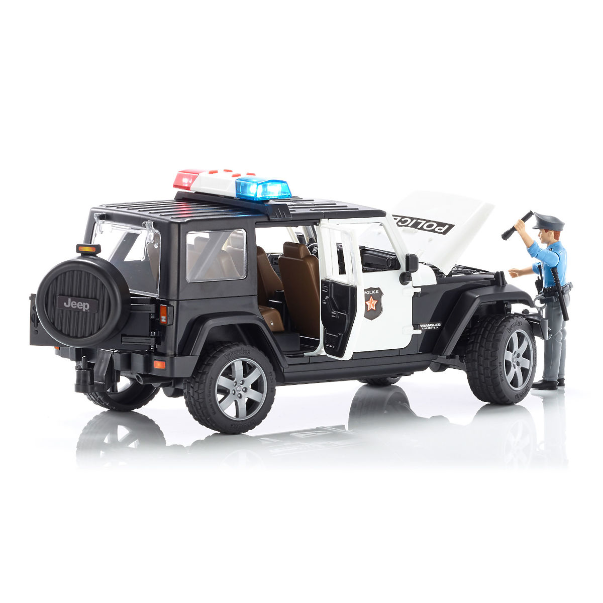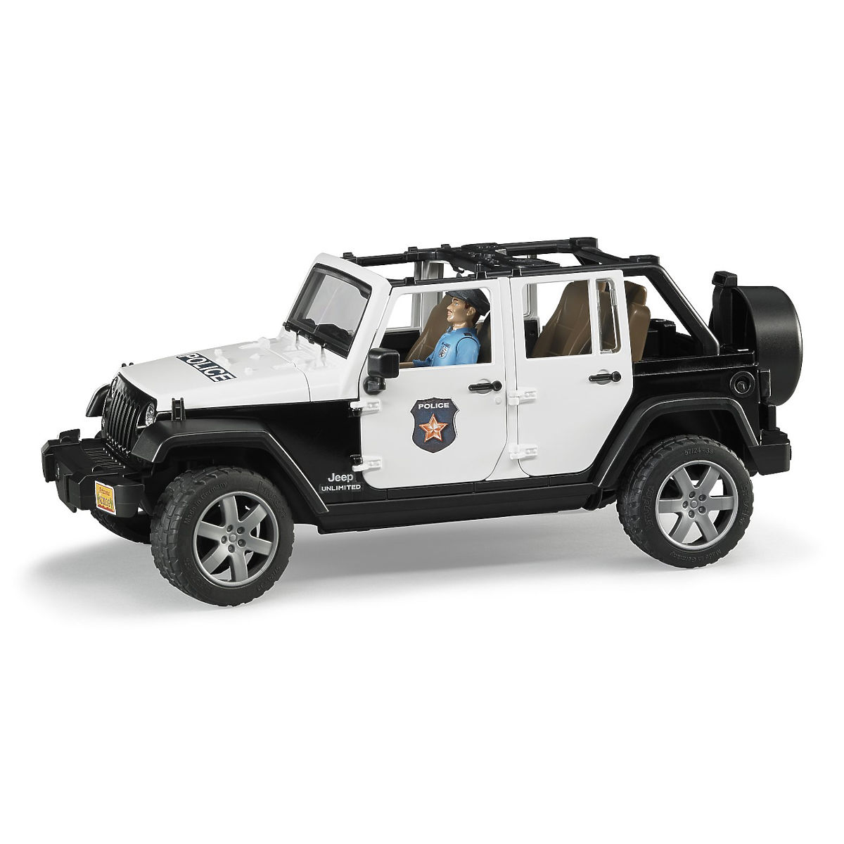 Bruder Jeep Wrangler Rubicon Polícia s figúrkou je novinkou roku 2015. Bruder Jeep Wrangler Rubicon je vernou kópiou skutočného Jeepu s veľmi detailne prepracovaným modelom motora a čiastočne zasklenou kabínou vodiča. Jeep má odnímateľnú dvojdielnu strechu, odnímateľné zadné sedadlá a odpruženú prednú aj zadnú nápravu. Možno ho riadiť pomocou prídavného volantu s dlhším ramenom, ktorý sa zasunie do existujúceho volantu a tým sa veľmi uľahčuje ovládanie vozidla. Má otvárateľné všetky bočné aj zadné dvere aj kapotu - možno nahliadnuť na blok motora. Súčasťou vozidla je figúrka policajta v uniforme, ktorému nechýba opasok s obuškom, pištoľ, baterka, putá a vysielačka. Jeep Wrangler Rubicon disponuje univerzálnym funkčným majákom so 4 zvukmi - zvuk motora, policajná siréna, siréna hasičov a tón výstrahy. Kompatibilný s figúrkami Bworld. Vyrobené v Nemecku, z kvalitných materiálov. Hlavné vlastnosti: otvárateľné dvere aj zadné okno, 2-dielna odnímateľná strecha, možnosť riadenia prídavným volantom, umiestneným v streche, odnímateľné zadné sedadlá, otvárateľná kapota umožňujúca pohľad na motor, ťažné zariadenie, miesto až pre 4 figúrky Bruder, držiaky pre príslušenstvo Bruder v prednom nárazníku, policajt má čiapku, pištoľ, opasok, obušok, baterku, putá a vysielačku, univerzálny maják so zvukom možno jednoducho pripojiť k autám Bruder a stlačením tlačidla zvoliť zodpovedajúci tón sirény (1. zvuk motora, 2. policajná siréna, 3. siréna hasičov, 4. tón výstrahy) vyrobené v Nemecku