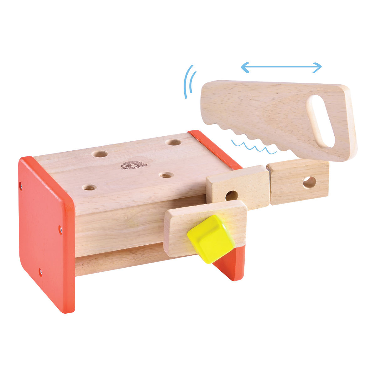 Podporte rozvoj svojho malého domáceho kutila pomocou premyslenej súpravy náradia. Náradie je dodávané v praktickej debničke s rukoväťou, ktorá sa po otočení premení na dielenský stôl vybavený zverákom. Deti sa s pomocou tejto hračky môžu naučiť základným manuálnym zručnostiam, používaniu kľúča, kladiva alebo páky. Vďaka premyslenému návrhu sa tiež naučia triediť veci podľa účelu a vy vďaka nemu ušetríte miesto. Hračka je vyrobená z detailne opracovaného, odolného masívneho dreva a drevoplastu, pričom atraktívne spája prírodné a sýte farebné odtiene. Hlavné vlastnosti:debnička vybavená zverákom, 5 dielov náradia a 6 dielov príslušenstvaodolné drevené prevedenievytříbená farebnosť a povrchová úprava