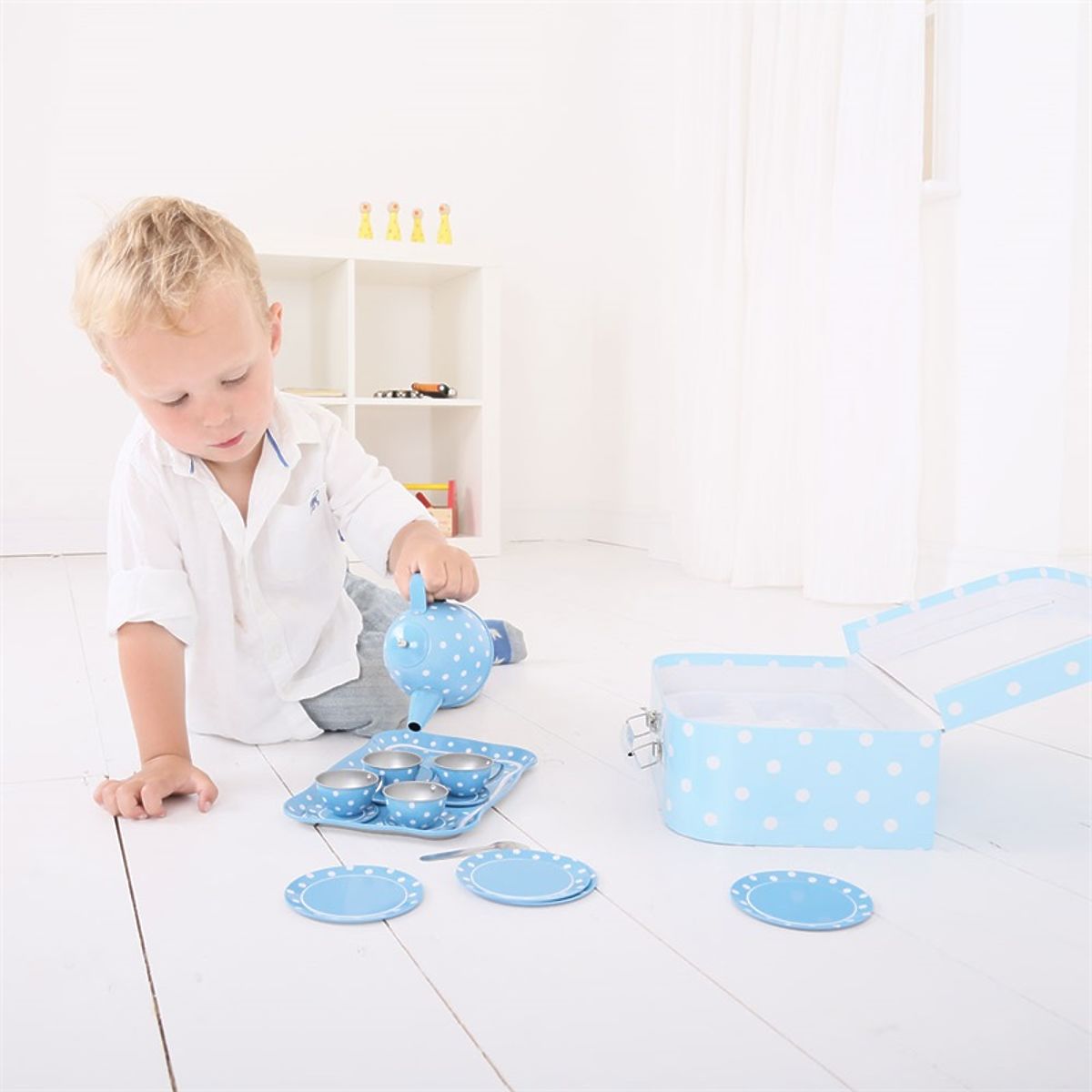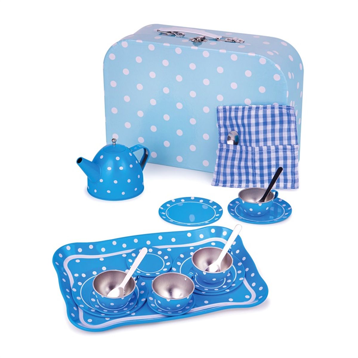 Táto nádherná bodkovaná čajová súprava obsahuje kartónový kufrík, v ktorom nájdete štyri kovové šálky a podšálky, čajovú kanvicu a lyžičky, tanieriky a servírovací podnos. Sada obsahuje všetko, čo deti potrebujú na čajový večierok. Hlavné vlastnosti: vhodné aj na cesty, skvelý spôsob, ako povzbudiť kreativitu a nápady, zodpovedá súčasným európskym bezpečnostným normám