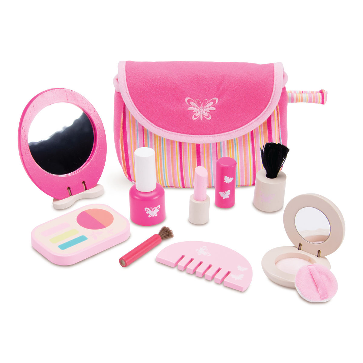 Táto ružová súprava so šminkami nadchne každé dieťa, ktoré sa rado parádi. Líčiť sa a napodobňovať svoje obľúbené idoly je s touto kompaktnou, ale bohatou sadou doslova hračka. Deti si môžu zábavnou formou osvojiť spoločenské spôsoby a zručnosti. Všetky líčidlá sú uložené v originálnej, roztomile pruhovanej taštičke zdobenej ikonou motýlika. Súčasti sú vyrobené z odolného masívneho dreva a umožňujú jednoduchú manipuláciu malými detskými rúčkami. Hlavné vlastnosti: taštička, zrkadielko, hrebeň, púdrenka, paletka, rúž, lak na nechty a 2 štetce praktické a kompaktné balenie odolné drevené prevedenie