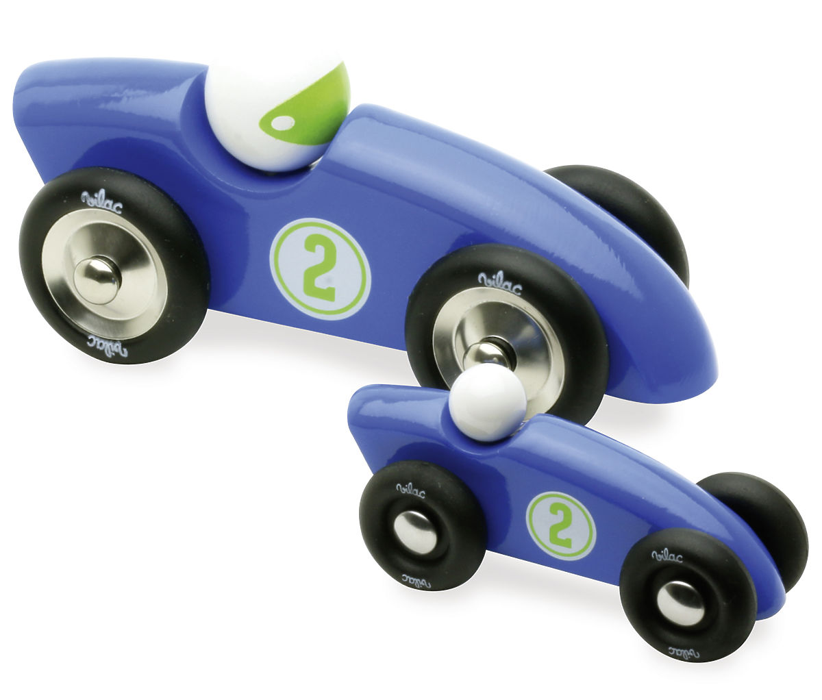 Modré závodné auto so špeciálnym dizajnom, vyrobené z lakovaného dreva s kovovými pogumovanými kolesami. Je vhodné na hranie aj ako dekorácia do izieb detí či dospelých. Vyrobené vo Francúzsku. Hlavné vlastnosti: vyrobené vo Francúzsku
