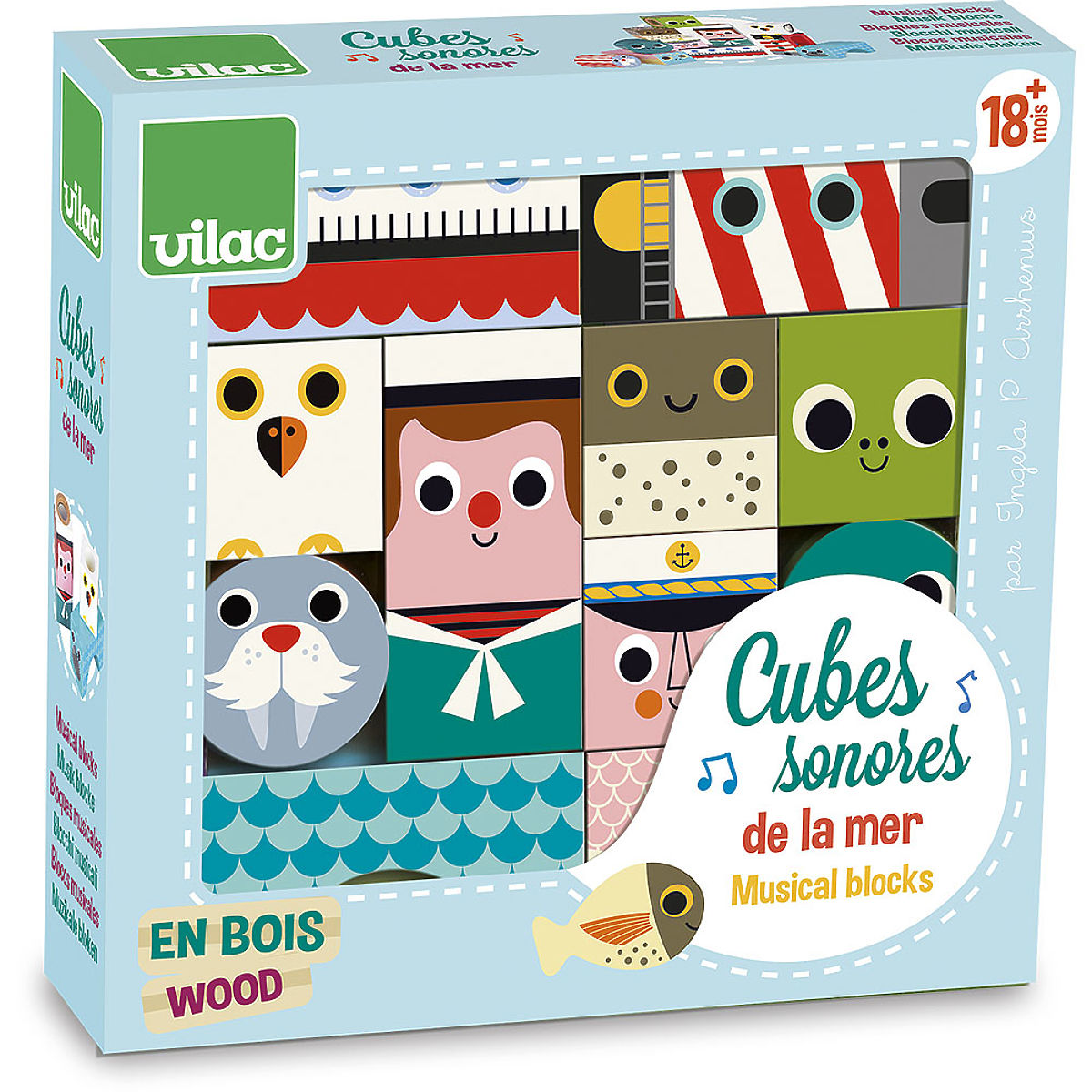 Jedenásť drevených zvukových kociek s motívom mora. S týmito kockami si deti precvičia motoriku aj zručnosť a zároveň budú objavovať zvuky. Pre deti veľmi pútavá hračka. Ilustrované Ingelou P. Arrhenius. Hlavné vlastnosti: edukatívne senzorické kocky obsahuje 11 kociek design Ingela P. Arrhenius Švédska umelkyňa Ingela Peterson Arrhenius sa narodila v roku 1967. Umenie a dizajn mali vždy miesto v jej živote a než začala jej kariéra ilustrátorky, Ingela pracovala ako umelecká vedúca v Štokholme. Potom študovala reklamný a grafický dizajn na umeleckej škole tiež v Štokholme. V roku 1992 začala podnikať ako ilustrátorka na voľnej nohe a pracovala medzinárodne naprieč reklamou, dizajnom, nakladateľstvom… V minulosti vytvárala tlačové vzory pre tkaniny, tapety, papiernictvo, tiež pracovala na obaloch, produktovom dizajne, bytových doplnkoch a hračkách. Jej plagáty a dizajnové hračky nájdete po celom svete. Má vášeň pre retro štýl, čo je jasne vidieť na jej dielach a tiež v jej nadšení pre typografiu a farby. Teraz žije v Štokholme s manželom a dvoma synmi.