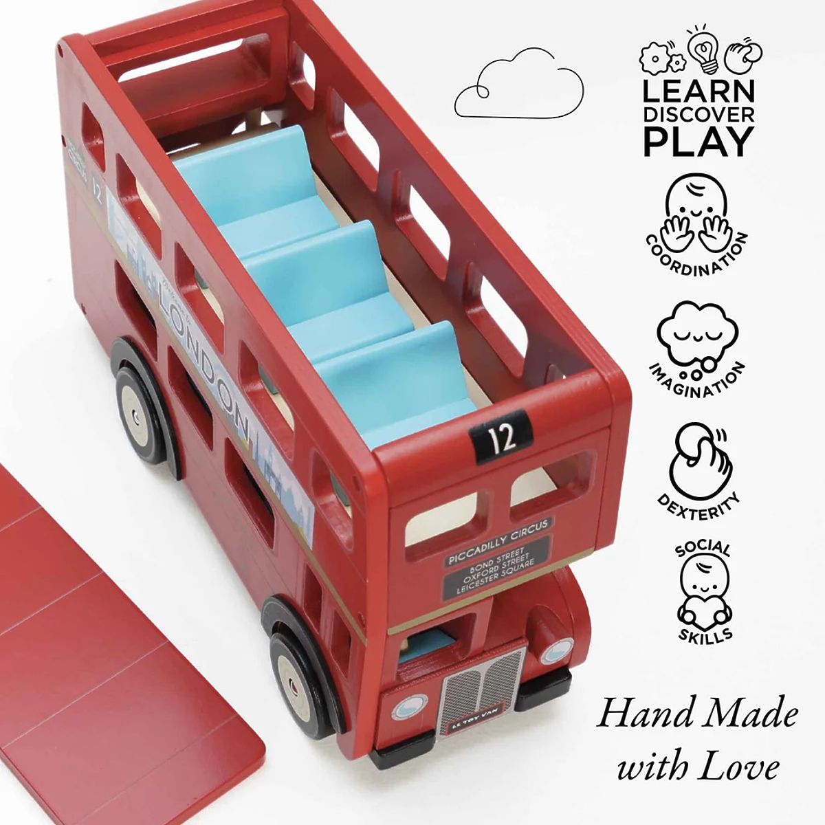 S autobusom Londýn môžete toto hlavné mesto precestovať bezpečne a štýlovo. Ikonická hračka získala niekoľko ocenení a je pravdepodobne najobľúbenejšou hračkou z ponuky Le Toy Van. Sýto červený exteriér londýnskeho dvojposchodového autobusu má realistické značenie, deti si s ním určite užijú veľa predstavivej zábavy. Samozrejme mu nechýbajú sedadlá, má odklápaciu strechu aj horné poschodie. Hračka pomáha s rozvojom predstavivosti, zručnosti a jemnej motoriky. Vyrobené z udržateľného dreva, maľované farbami na báze vody. Hračky s účelom Všetky hračky firmy Le Toy Van sú vyrobené s cieľom – aby dlho vydržali. Dizajnované s láskou skúsenými remeselníkmi za použitia etických praktík a udržateľných materiálov, ktoré sú šetrnejšie k našej planéte. Hlavné vlastnosti: vyrobené eticky z udržateľného FSC dreva testované podľa najprísnejších štandardov maľované netoxickými farbami na báze vody inšpiruje k predstavivej hre rozvíja kognitívne zručnosti hračka bez obsahu plastu Ocenenia hračky: Junior Design Best Online Fashion Retailer Award 2011 Right Start Best Toy Gold Award 2011 Auta & stavby: Stavebná a motorická kolekcia Le Toy Van, ktorá získala mnoho ocenení. Presnejšie zatiaľ viac ako 15 ocenení za predstavivé autá a stavebné hračky. Podporujú detskú fantáziu, sú ideálne na predstavivú hru, rozvíjajú kreativitu a hravo zlepšujú detskú koordináciu ruka-oko. Značka a certifikát FSC® (Forest Stewardship Council) zaručuje, že drevo, z ktorého bol produkt vyrobený, nebolo ťažené nelegálne a pochádza z lesov obhospodarovaných šetrným alebo prírode blízkym spôsobom, v ktorom sú dodržiavané prísne environmentálne a sociálne požiadavky. Značka FSC® na výrobku znamená, že svojím nákupom pomáhate chrániť lesy a podporujete šetrné, zodpovedné alebo prírode blízke hospodárenie, vďaka ktorému sú naše lesy stabilnejšie, zdravšie, majú prirodzenú druhovú skladbu a lepšie odolávajú negatívnym následkom klimatických zmien.