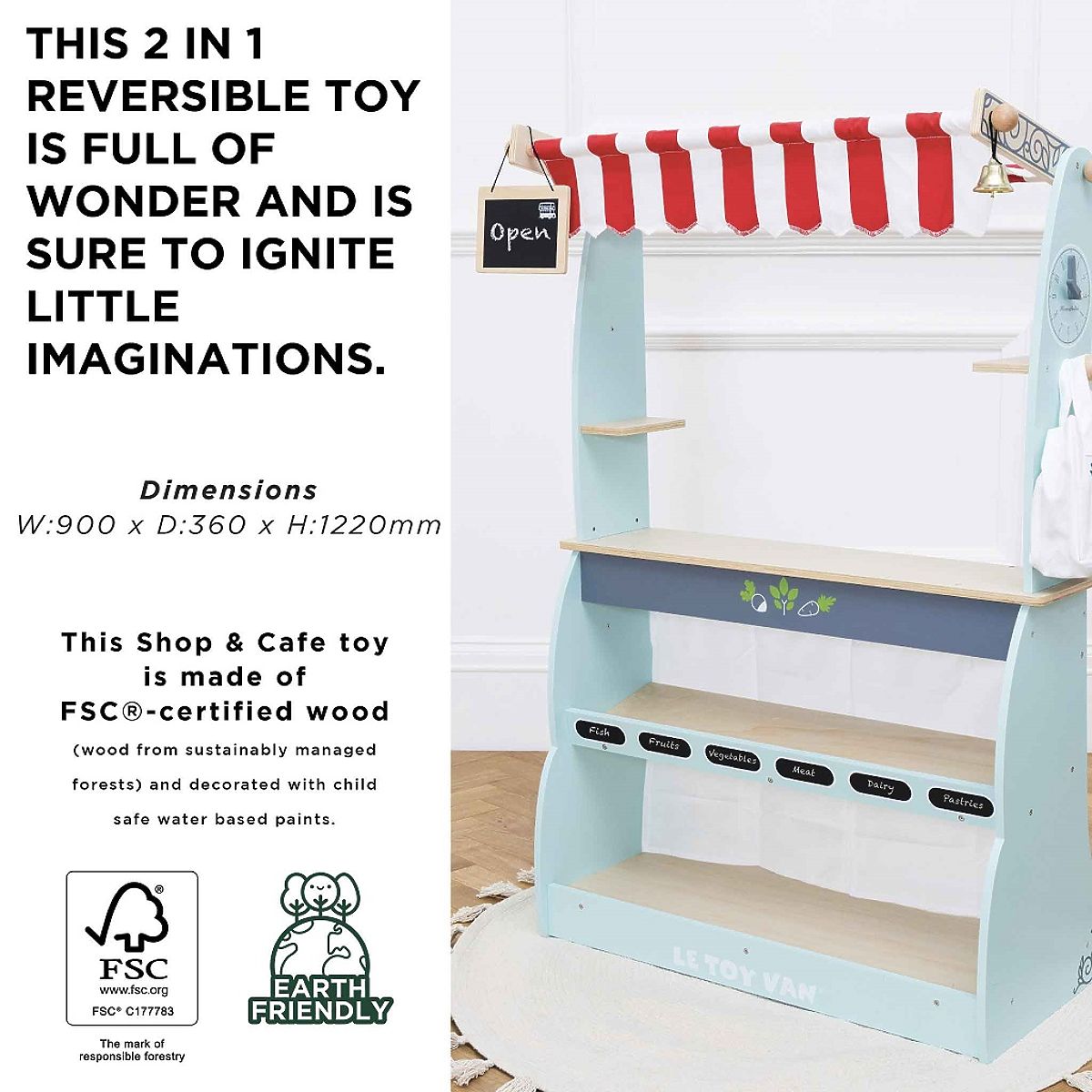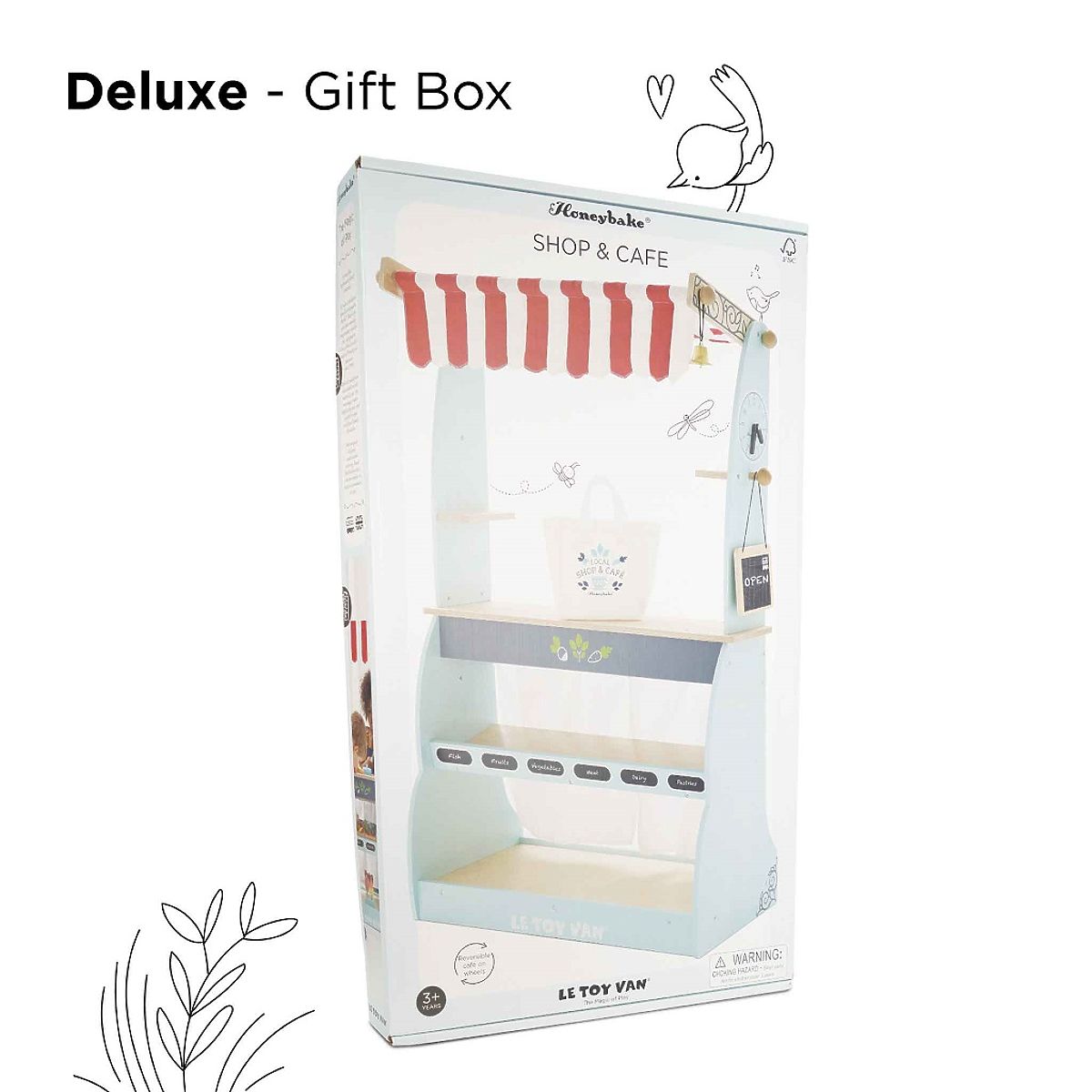 Skvelý a všetkými obľúbený drevený predajný pult vyhral niekoľko ocenení! Deťom poslúži ako obchod aj kaviareň, naozaj záleží len na ich predstavivosti. Pult 2 v 1 stačí otočiť, na jednej strane má predajné police, do ktorých sa zmestia debničky a produkty, na strane druhej priestor vhodný na prípravu a servírovanie horúcich nápojov. Nechýba ani obojstranná tabuľka na kriedu, textilná nákupná taška a zvonček. Deti si pri predstavivej hre precvičia nielen sociálne zručnosti. Možno kombinovať s debničkami s jedlom od Le Toy Van. Hračky s účelom Všetky hračky firmy Le Toy Van sú vyrobené s cieľom – aby dlho vydržali. Dizajnované s láskou skúsenými remeselníkmi za použitia etických praktík a udržateľných materiálov, ktoré sú šetrnejšie k našej planéte. Hlavné vlastnosti: vyrobené eticky z udržateľného dreva testované podľa najprísnejších štandardov maľované netoxickými farbami na báze vody inšpiruje k predstavivej hre rozvíja kognitívne zručnosti kolieska pre jednoduchý transport Ocenenia hračky: Junior Design Bronze Award 2017 Good Toy Guide Recommended Right Start Best Toy Award Winner 2017 Honeybake kolekcia: Hračky v tejto kolekcii sú vhodné na objavovanie, pomôžu deťom s rozvojom predstavivosti, sociálnych a verbálnych zručností a kognitívnych funkcií. Tradičný dizajn s modernými detailmi deti určite bude baviť. Honeybake je kolekcia Le Toy Van, ktorá vyhrala najviac ocenení, a to za dizajn, kvalitu, bezpečnosť a tiež za vzdelávaciu a hernú hodnotu.