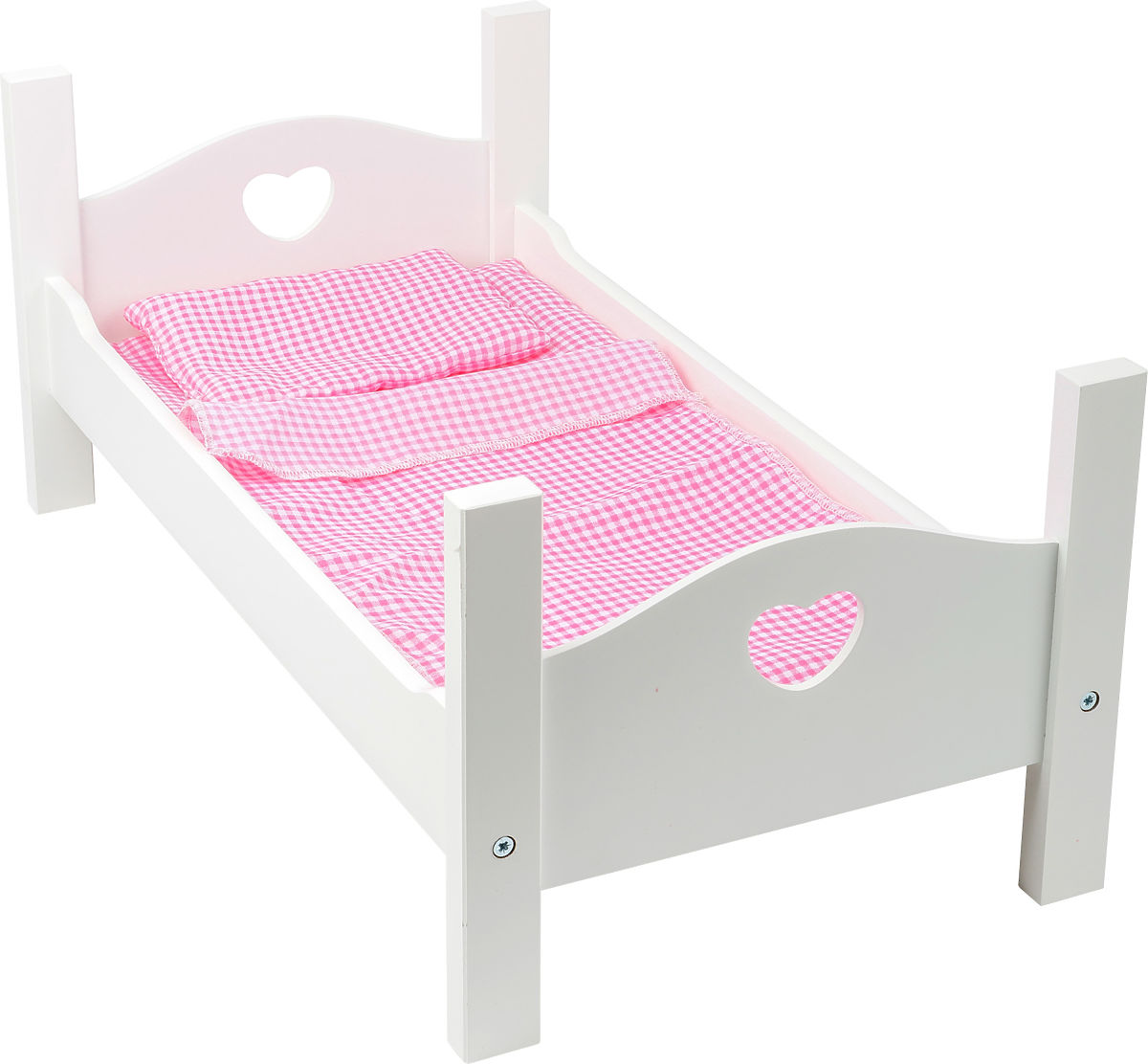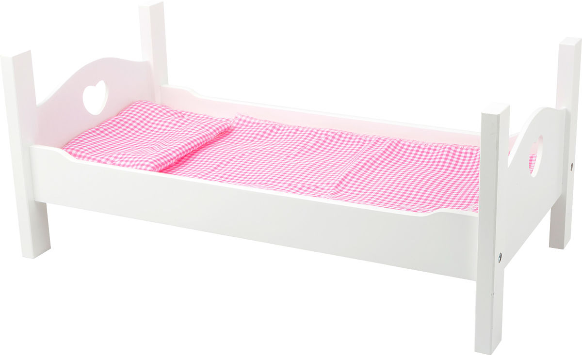 V tejto postieľke sa bábike či plyšákovi bude spať sladko! Moderná drevená postieľka v bielej farbe s detailmi srdiečok na čelách. Súčasťou balenia je vankúš, deka a prestieradlo. Skvelý doplnok k sade nábytku pre bábiky. Hlavné vlastnosti: pre bábiky do veľkosti 45 cm vrátane posteľnej bielizne