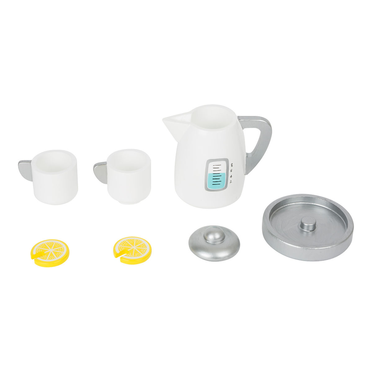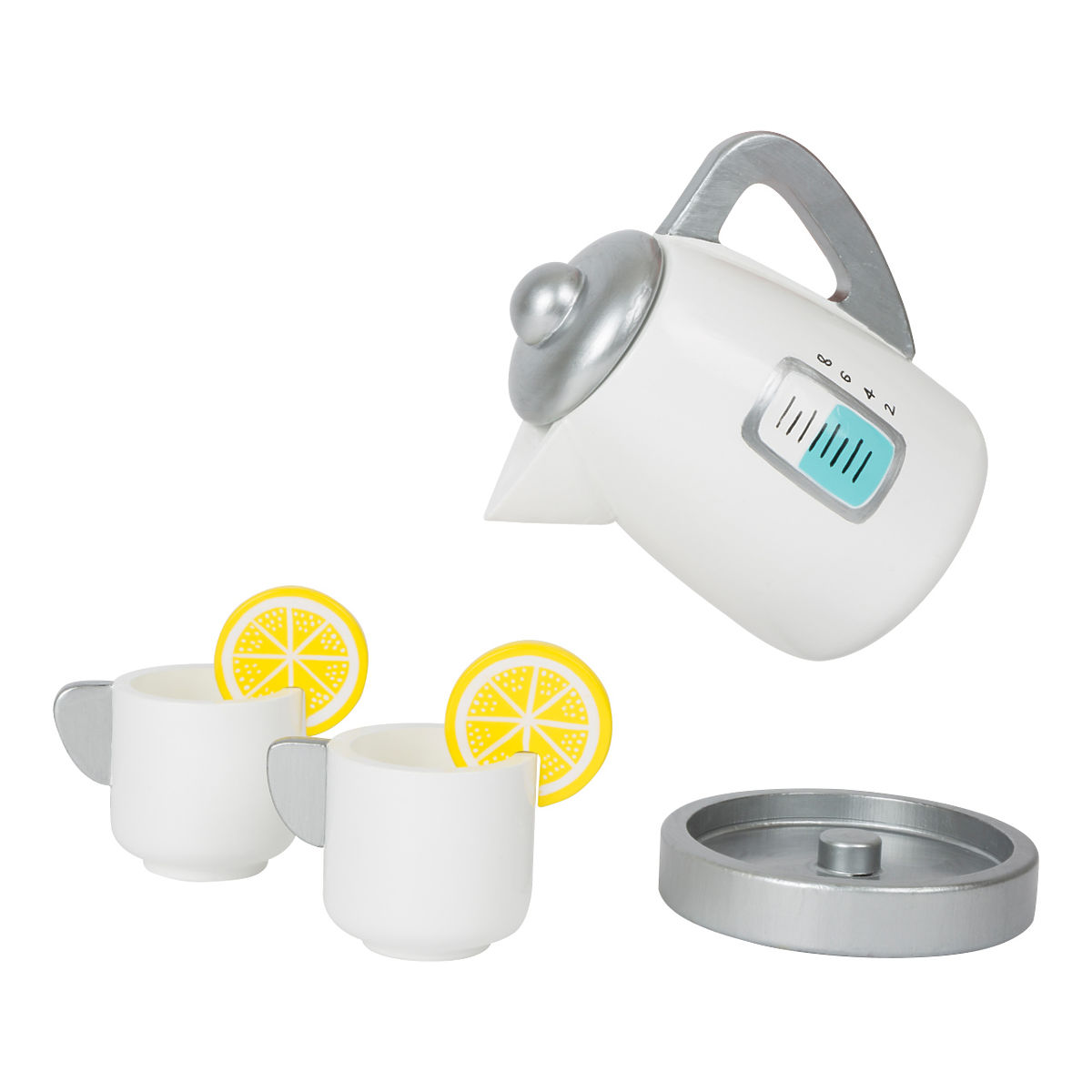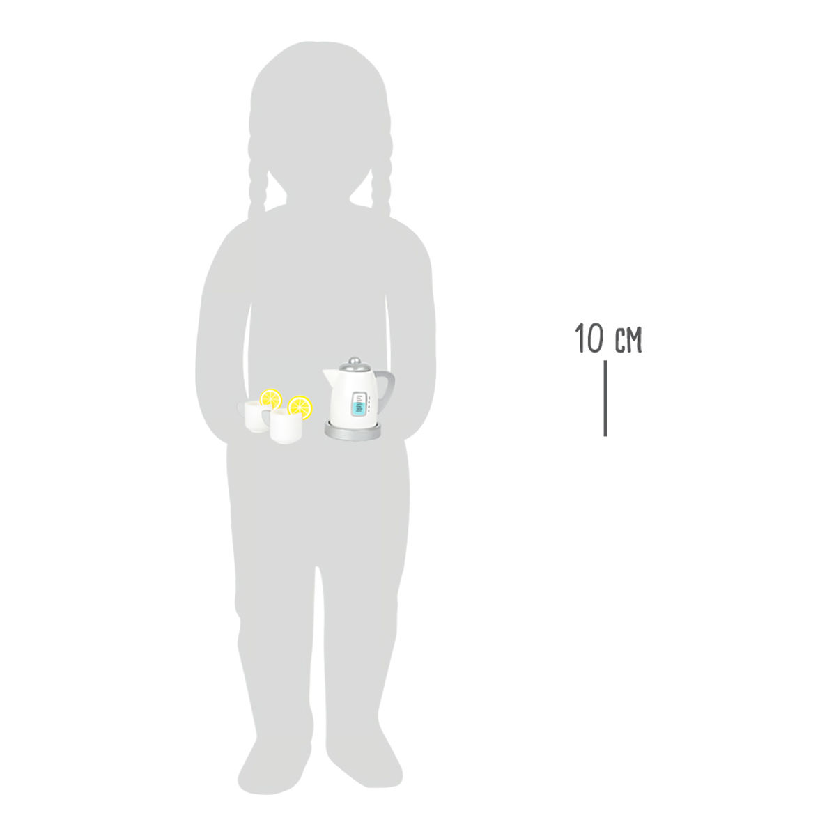 Nie je nad šálku horúceho čaju ozdobenú šťavnatým plátkom citróna! Naučte deti pravidlá servisu a spoločenského správania so súpravou rýchlovarnej kanvice a hrnčekov. Skvele doplní detské kuchynky, iné servisy, raňajkové sady alebo makety pečiva a zákuskov. Súčasti sú vyrobené z kombinácie masívneho dreva a silnej preglejky, hračka vďaka tomu môže ponúknuť vysokú odolnosť a životnosť. Hlavné vlastnosti: kanvica s viečkom a podstavou, 2 šálky a 2 citróny, robustné a odolné drevené prevedenie