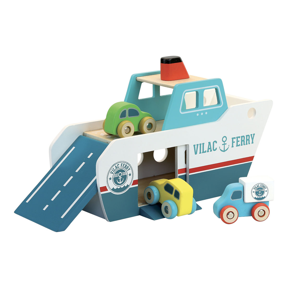 Na palubu! Nalodte včas všetky autíčka a prekonajte trajektom rieku alebo more. Loď je vybavená posuvnými dverami, za ktorými sa ukrýva priestranné podpalubie s parkoviskom. Pomocou sklopnej rampy môžu vodiči získať prístup aj na hornú palubu. Súčasťou balenia je niekoľko rôznych autíčok, ktoré môžu deti bezprostredne prepravovať. Hračka vyniká vybranou farebnosťou, vďaka ktorej vkusne doplní interiér detskej izby. Neváhajte a doplňte ju o Malú garáž Vilacity, s ktorou tvorí harmonickú kolekciu. Vyrobené z odolného masívneho dreva a silnej preglejky. Hlavné vlastnosti: trajekt a 3 autíčka, posuvné bočné dvere a sklopná rampa, jedinečný dizajn, robustné a odolné prevedenie