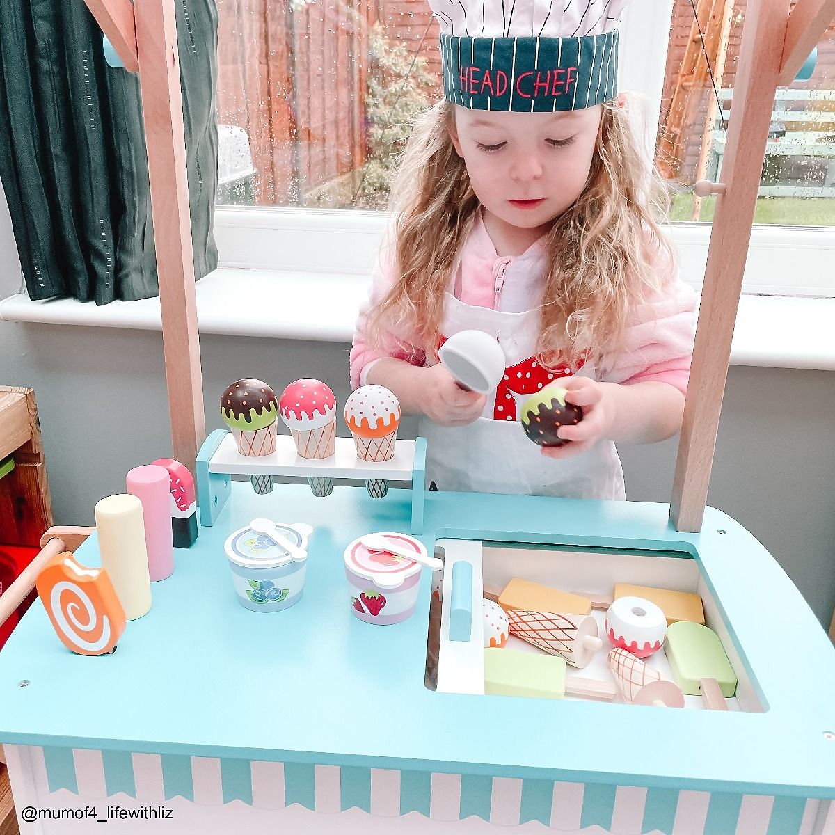 Naservírujte priateľom a rodine lahodnú zmrzlinu... Tento kvalitný drevený vozík na zmrzlinu je dodávaný so 6 zmrzlinami, 9 nanukmi, 2 zmrzlinovými pohármi s lyžičkami a naberačkou na zmrzlinu. Tieto sladké pochúťky sú dokonalým doplnkom na hranie. Skvelý spôsob, ako podporiť kreatívne a nápadité hranie rolí. Vyrobené z vysoko kvalitných, zodpovedne získaných materiálov. Spĺňa aktuálne európske bezpečnostné normy. Hlavné vlastnosti: drevený vozík na zmrzlinu kompletný so 6 zmrzlinami, 9 nanukmi, 2 pohármi na zmrzlinu s lyžičkami a naberačkou na zmrzlinu pomáha rozvíjať slovnú zásobu pri predaji a servírovaní zmrzliny svojim priateľom