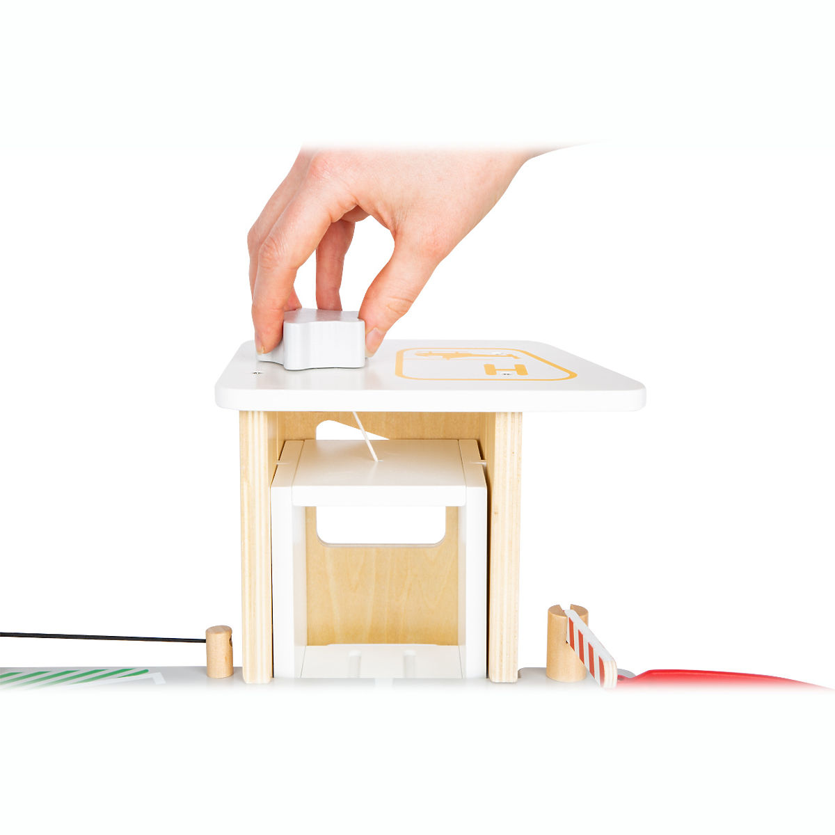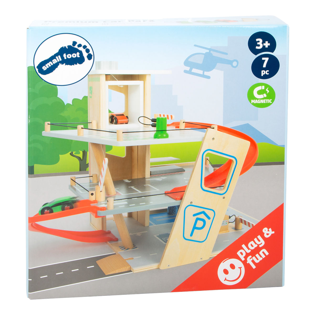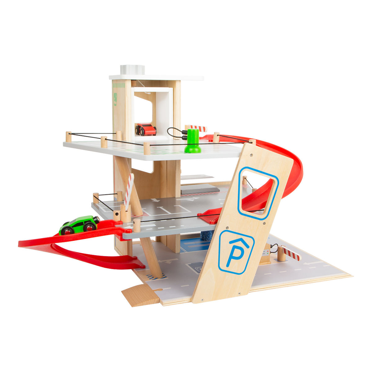 Parkujte, tankujte, umývajte alebo opravujte, a to všetko s jednou garážou! Ponúka tri bohato vybavené poschodia prepojené atraktívnym funkčným výťahom a zábavnými, na seba plynulo nadväzujúcimi rampami. Jej súčasťou je dvojica autíčok, ktoré môžu pri fantastických hrách využiť pumpu, nabíjaciu stanicu, zdvíhaciu rampu alebo umývačku s realistickými kefami. Každá z úrovní je navyše vybavená mechanickou závorou pre dokonale pútavé zážitky. Poschodia sú opatrené gumovým hrazením, ktoré dodávajú jazde autíčok na dynamike a bránia ich vypadnutiu. Garáž je podrobne zdobená mnohými farebnými ikonami a značením, ktoré do hier vnesú aj poučenie. Je vyrobená z pevnej, odolnej drevenej preglejky s doplnkami z masívneho dreva a nezávadného plastu. Výrobok vyžaduje montáž, dodáva sa s obrázkovým návodom na zostavenie. Hlavné vlastnosti: garáž a 2 autíčka, 3 poschodia prepojené funkčným výťahom a 2 rampami, pumpa, nabíjacia stanica, zdvíhacia rampa, umývačka a 3 závory, kompatibilné s vláčkodráhami a súvisiacim príslušenstvom iných výrobcov, bohato zdobené jednoduchými ikonami a značením, pevné a odolné drevené prevedenie