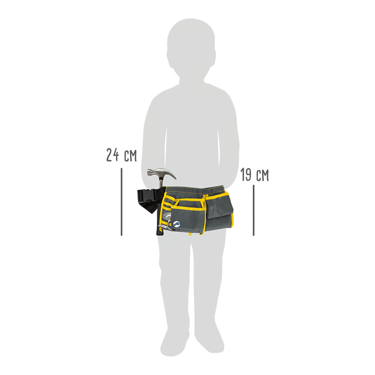 S týmto robustným opaskom na náradie budú mať deti svoje nástroje vždy po ruke. Či už je to tesárske kladivo, plochý alebo krížový Phillips skrutkovač, kovový tesársky uholník, ochranné okuliare, pracovné PU rukavice, pružinové svorky a klince, ceruzka a strúhadlo alebo meracia páska. Tento rozsiahly set musí mať každý mladý kutil alebo kutilka. Nastaviteľný opasok so zapínaním na pracku má 8 priehradiek, pútko na kladivo, tiež karabínu. Vodováha má na strane magnetický pásik, je univerzálna – dokáže merať vodorovne, zvislo aj v 45°. Kladivo má gumovú rukoväť, aby deťom nevykĺzlo z ruky. Skrutkovanie, zatĺkanie kladivom, meranie, náčrty, to všetko trénuje zručnosť detí. Realistické náradie pre deti bude perfektnou pomôckou pre ich prvý projekt. Opasok je ideálny pre väčšie deti. Hlavné vlastnosti Nastaviteľný opasokZapínanie na prackuDetské ale realistické náradie