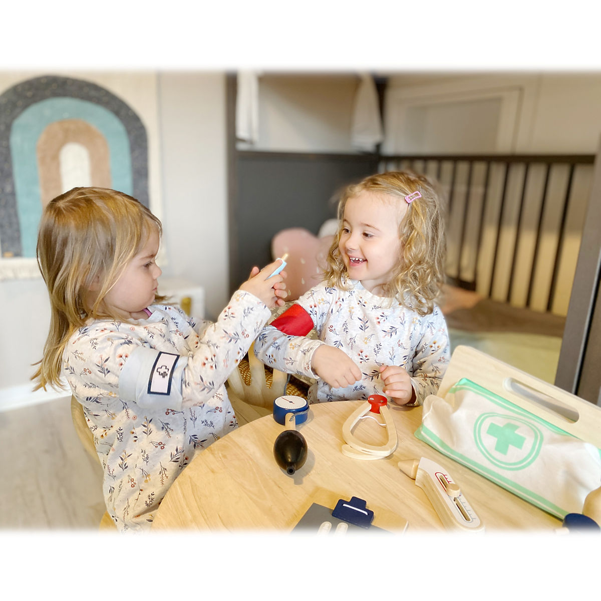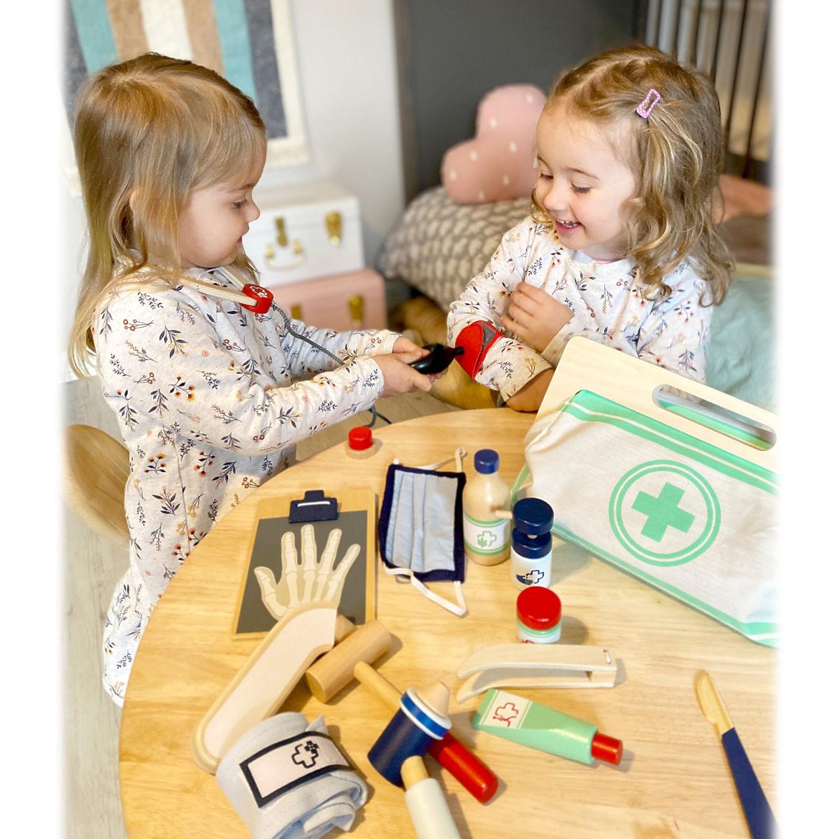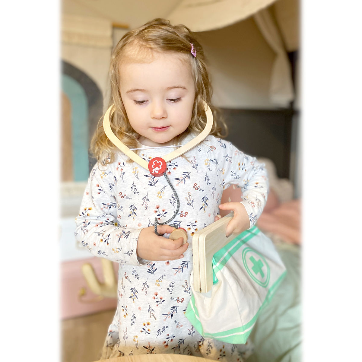 S touto štandardnou lekárskou taškou budú mladí nádejní lekári perfektne vybavení. Taška je vyrobená z mäkkého textilu, je pekná na pohľad a tiež veľmi funkčná. Dá sa ľahko otvoriť vďaka magnetom, je vyrobená z dreva. Vo vnútri tašky nájdete všetko vybavenie pre predstavivé ošetrenie pacientov: stetoskop, teplomer, striekačku a mnoho ďalšieho – všetko vyrobené z pevného dreva! Najlepšími doplnkami sú pravdepodobne tlakomer s manžetou a balónikom a otoskop s lupou. Tento rozsiahly set lekárskych hračiek obsahuje mnoho „skutočných“ lekárskych nástrojov a prístrojov, s ktorými sa deti naozaj vyhrajú. Ilustrácie na lekárskych pomôckach deťom pomôžu rozpoznať nástroje a tiež im možno zjednodušia ich použitie. Hlavné vlastnosti: Lekárska taška s jasne viditeľným drevomTlakomer s manžetou a balónikomTeplomer s nastaviteľnou teplotouOtoskop so skutočnou lupouFľaštička na lieky so skrutkovacím viečkomNáplasti na suchý zipsZnovu použiteľné a prateľné detské textilné rúškyĎalšie vybavenie: injekčná striekačka s pohyblivým mechanizmom, stetoskop, dezinfekcia s pumpičkou, fľaštička s liekmi a lyžička, pinzeta, skalpel, reflexné kladivo