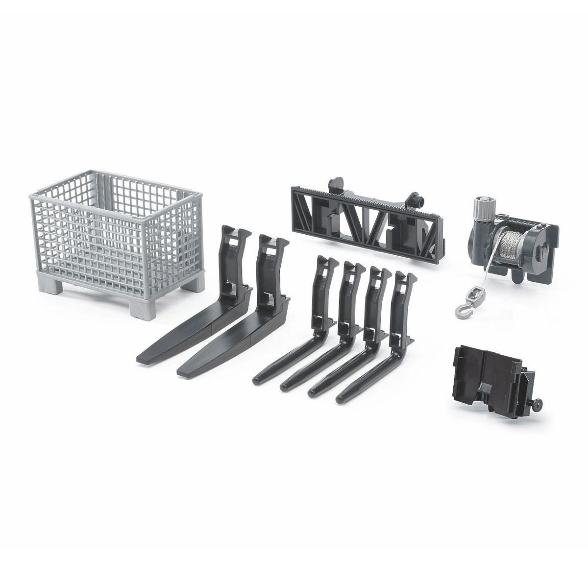 Sada, ktorá vám umožní prestavať nakladače na manipulátory s paletami a paletovými košmi, alebo je možné použiť navijak pre takmer neobmedzenú priechodnosť terénom. Sada bola vyrobená v mierke 1:16 k skutočným komponentom ako verná plastová kópia. Ide o veľmi kvalitné spracovanie nemeckej firmy BRUDER do najmenších detailov, vyrobené v Nemecku z vysoko kvalitného ABS plastu, pružného plastu s lesklým povrchom, precízne bez akýchkoľvek otrepov či pretekov. Kompatibilné s traktormi Bruder: 2042, 2052, 2062, 2112, 3011, 3021, 3031, 3041, 3051, 3091, 3096 Kompatibilné so strojmi Bruder: 2125, 2129, 2136, 2140, 2141, 2431, 2441, 3580
