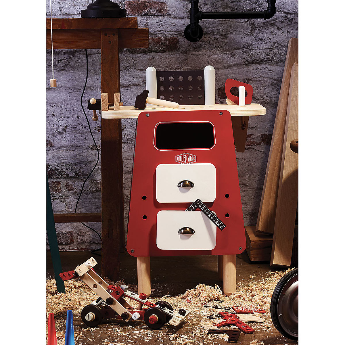 Tento originálny drevený pracovný ponk s vintage vzhľadom deťom umožní tvoriť rovnako, ako to vidia u dospelých. Magická pracovná doska, ktorá drží pohromade vďaka suchému zipsu, umožňuje deťom rezať drevo bez rizika úrazu. Kladivom zaklepú detské drevené klince. Skrutkovačom a kľúčom veci zmontujú a opäť rozmontujú podľa gusta. Predstavivosť, trpezlivosť a vynaliezavosť. Nechajte talent najmenších zažiariť! Obojstranný kufor s náradím od Ateliéru Vilac. Hlavné vlastnosti: obsahuje 76 ks príslušenstva, dizajn od Ateliéru Vilac, možno zostaviť 4 modulárne konštrukcie. Ateliér Vilac. Postavte, renovujte, urobte si sami, jedným slovom... sen! Úplne nová rada pre kutilov. Ako by ste naozaj cítili vôňu dreva, dotýkali sa hoblin z bukového dreva na podlahe dielne. Ponorte sa s nami do tohto kreatívneho sveta, ktorý dá voľnú ruku fantázii malých aj veľkých detí. Krásna vintage kolekcia s modulárnymi a doplnkovými hračkami.
