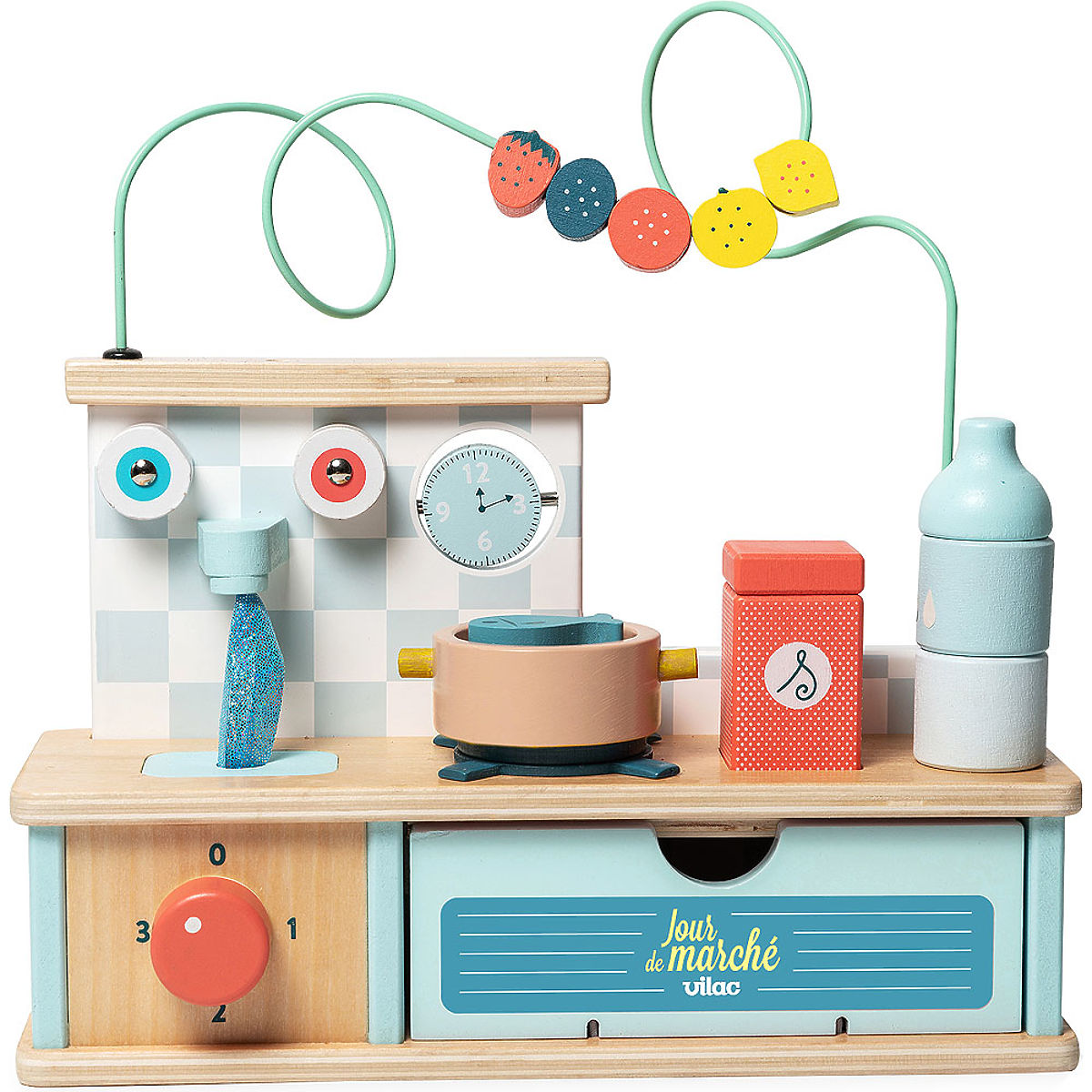 Táto drevená multifunkčná motorická kuchynka je určená pre najmenších a ponúka množstvo prekvapení a rôznorodých aktivít! Bludisko s ovocím, otočné hodiny, stohovateľnú fľašu a soľničku. Umiestnite ryby do hrnca a uvarte ich ako dospelí. Potom otvorte dvierka rúry, aby ste do nej vložili koláče, otočením gombíka začnite piecť. Hmmm, vonia to tak dobre! Ak chcete umyť riad, stačí otvoriť kohútiky. Táto motorická kuchynka bola navrhnutá tímom špecialistov firmy Vilac pre zmyslový rozvoj detí. Hlavné vlastnosti: interaktívne motorické prvky, cvakajúce gombíky, otváracia rúra, vhodné pre deti od 18 mesiacov, pre zmyslový rozvoj detí.
