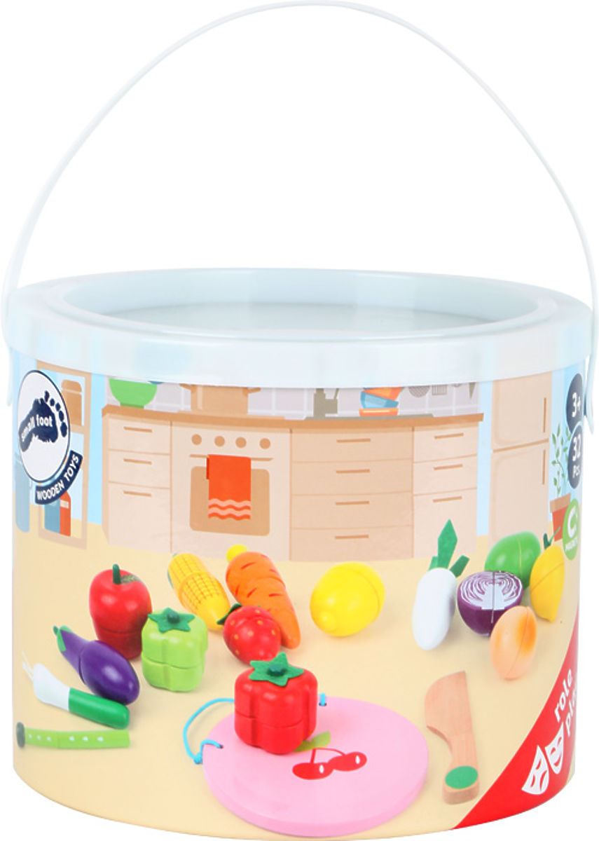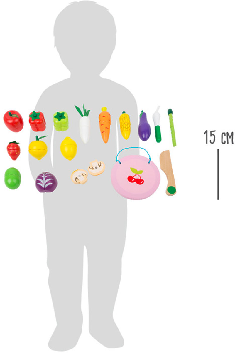 Poškodený obal výrobku. Nový tovar bez závad. Táto zmes ovocia a zeleniny má čo ponúknuť. Rôzne druhy ovocia a zeleniny sú maľované tak, aby vyzerali ako skutočné potraviny. Jednotlivé časti držia pohromade vďaka suchému zipsu (okrem jarnej cibuľky a špargle). Nôž na krájanie hračiek a drevená doska sú súčasťou. Je to chutný zážitok z hrania, ktorý podporuje aj kreativitu a fantáziu. Všetko môže byť bezpečne uložené v praktickom valcovom obale z pevnej lepenky. Táto sada je ideálnym doplnkom detských kuchyniek a obchodov. Hlavné vlastnosti: podporuje kreativitu a fantáziu, ideálna aj na cesty