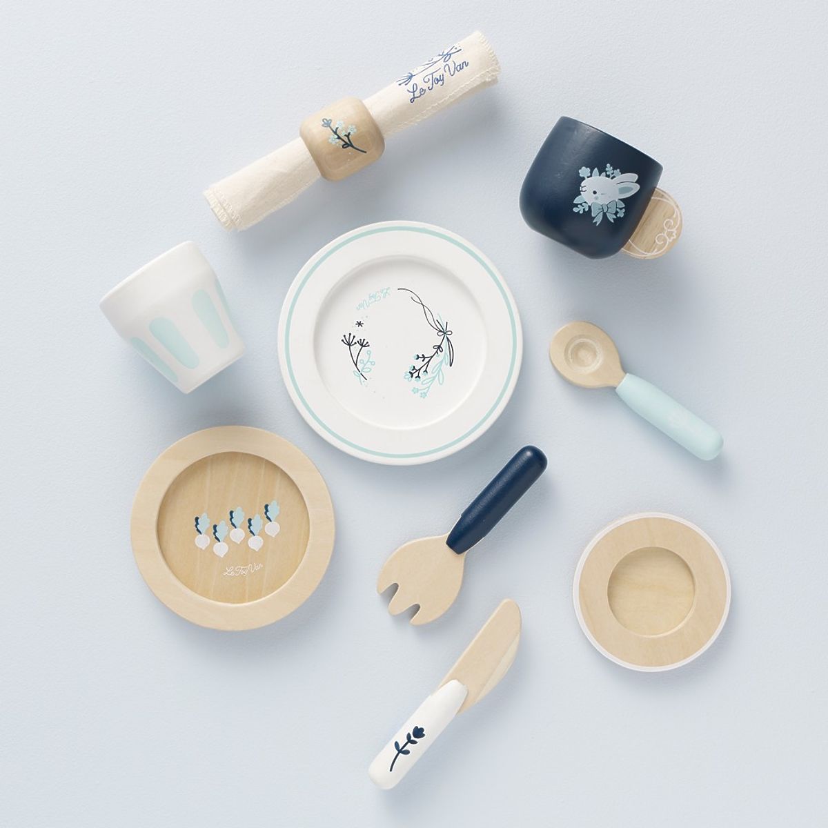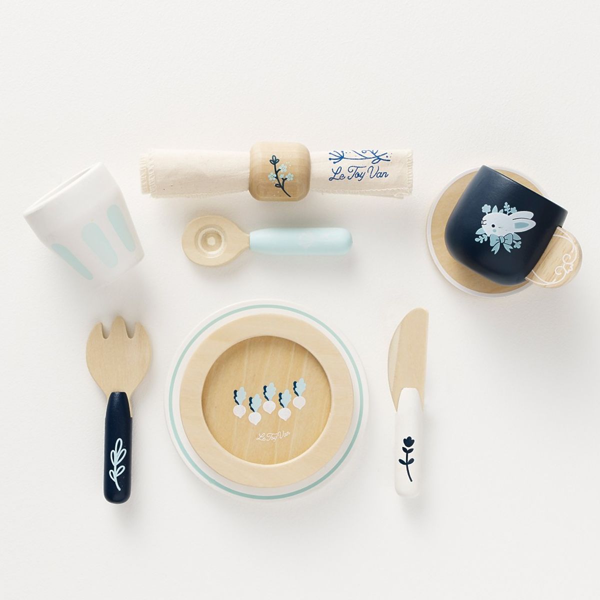 Obed chutí lepšie, keď je servírovaný na peknom riade. Táto hračka je udržateľná a vydrží vám naozaj dlho. Prírodná farba dreva, biela a odtiene modrej k sebe pekne ladia, nechýbajú ani ilustrácie rastlín. V sade nájdete hrnček, podšálku, pohárik, 2 taniere, nôž, vidličku, lyžicu a obrúsok s dekoratívnym krúžkom. Deti si pri predstavivej hre precvičia jemnú motoriku, zručnosť a koordináciu ruka-oko. Maľované netoxickými farbami na báze vody. Hračky s účelom Všetky hračky firmy Le Toy Van sú vyrobené s cieľom – aby dlho vydržali. Dizajnované s láskou skúsenými remeselníkmi za použitia etických praktík a udržateľných materiálov, ktoré sú šetrnejšie k našej planéte. Hlavné vlastnosti: vyrobené eticky z udržateľného dreva testované podľa najprísnejších štandardov maľované netoxickými farbami na báze vody inšpiruje k predstavivej hre rozvíja kognitívne zručnosti Honeybake kolekcia: Hračky v tejto kolekcii sú vhodné na objavovanie, pomôžu deťom s rozvojom predstavivosti, sociálnych a verbálnych zručností a kognitívnych funkcií. Tradičný dizajn s modernými detailmi deti určite bude baviť. Honeybake je kolekcia Le Toy Van, ktorá získala najviac ocenení, a to za dizajn, kvalitu, bezpečnosť a tiež za vzdelávaciu a hernú hodnotu. Značka a certifikát FSC® (Forest Stewardship Council) zaručuje, že drevo, z ktorého bol produkt vyrobený, nebolo ťažené nelegálne a pochádza z lesov obhospodarovaných šetrným či prírode blízkym spôsobom, v ktorom sú dodržiavané prísne environmentálne a sociálne požiadavky. Značka FSC® na výrobku znamená, že svojím nákupom pomáhate chrániť lesy a podporujete šetrné, zodpovedné či prírode blízke hospodárenie, vďaka ktorému sú naše lesy stabilnejšie, zdravšie, majú prirodzenú druhovú skladbu a lepšie odolávajú negatívnym následkom klimatických zmien.