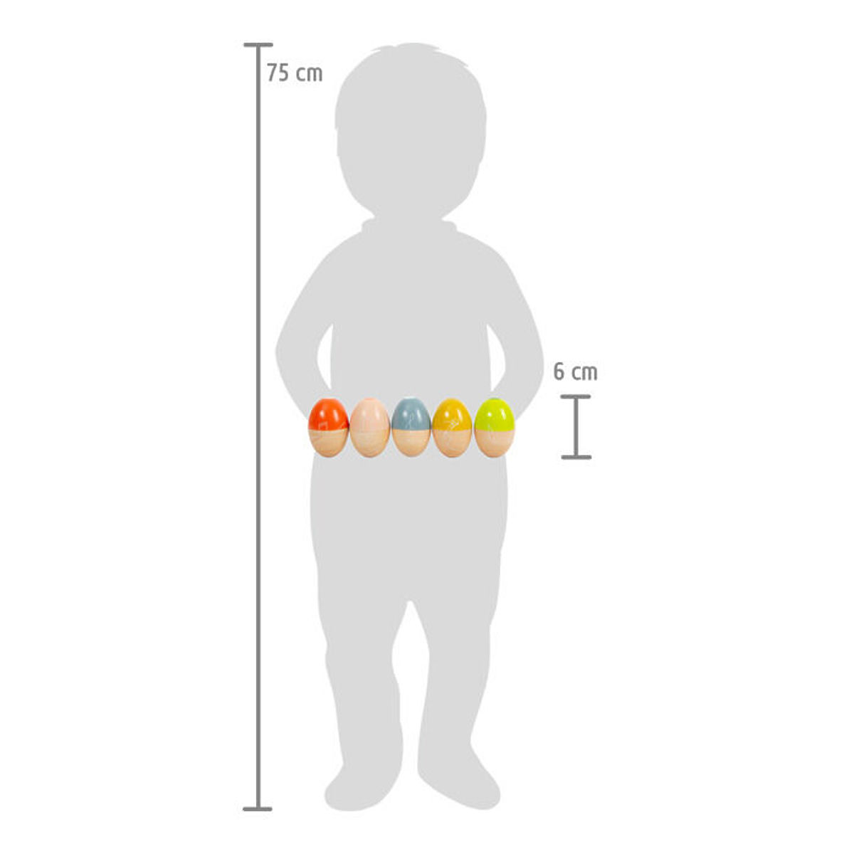 Traste, chrastite a valajte! Vytvorte tak báječné zvuky a niečo príjemné pre vaše uši! Každé z piatich chrastiacich vajíčok vyrobených z robustného masívneho dreva vydáva iný zvuk a ponúka všetky druhy rytmickej zábavy. Vajíčka majú krásny tvar a detská rúčka ich ľahko uchopí. Vďaka kombinácii prírodného dreva a moderných kontrastných farieb sú tieto hudobné vajíčka tiež vizuálnymi pútačmi! Absolútny hit pre milovníkov zvuku! Hudobné chrastiace vajíčka trénujú akustické vnímanie aj zmysel pre rytmus a tiež rytmiku a koordináciu ruka-oko. Ideálne pre ranú hudobnú výchovu! Hlavné vlastnosti: Rozvíja jemnú motoriku a kreativituHravý úvod do sveta zvuku a rytmuKaždé hudobné vajce vydáva iný zvuk