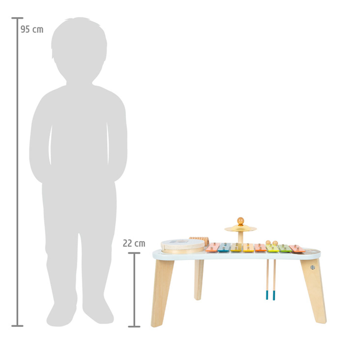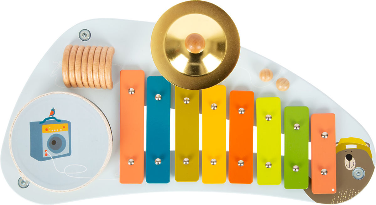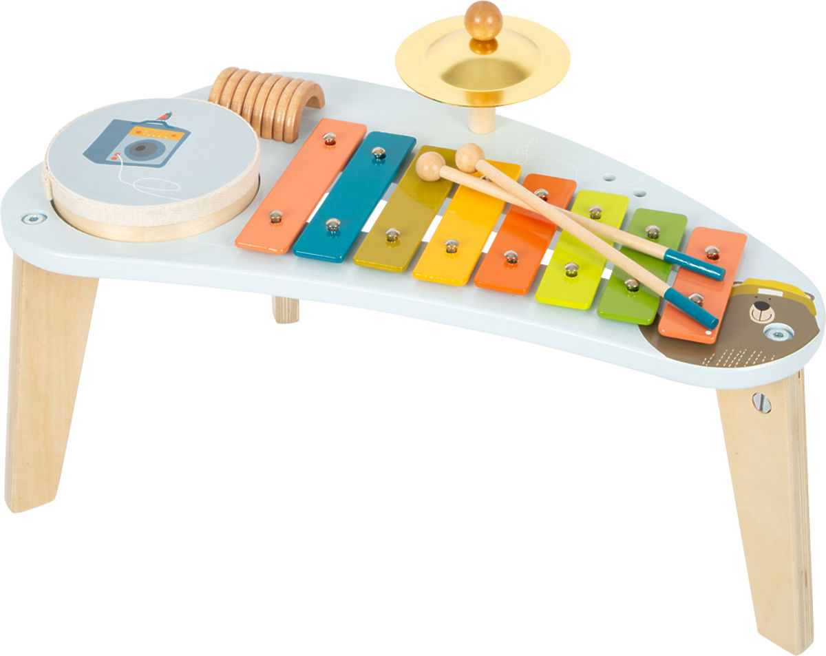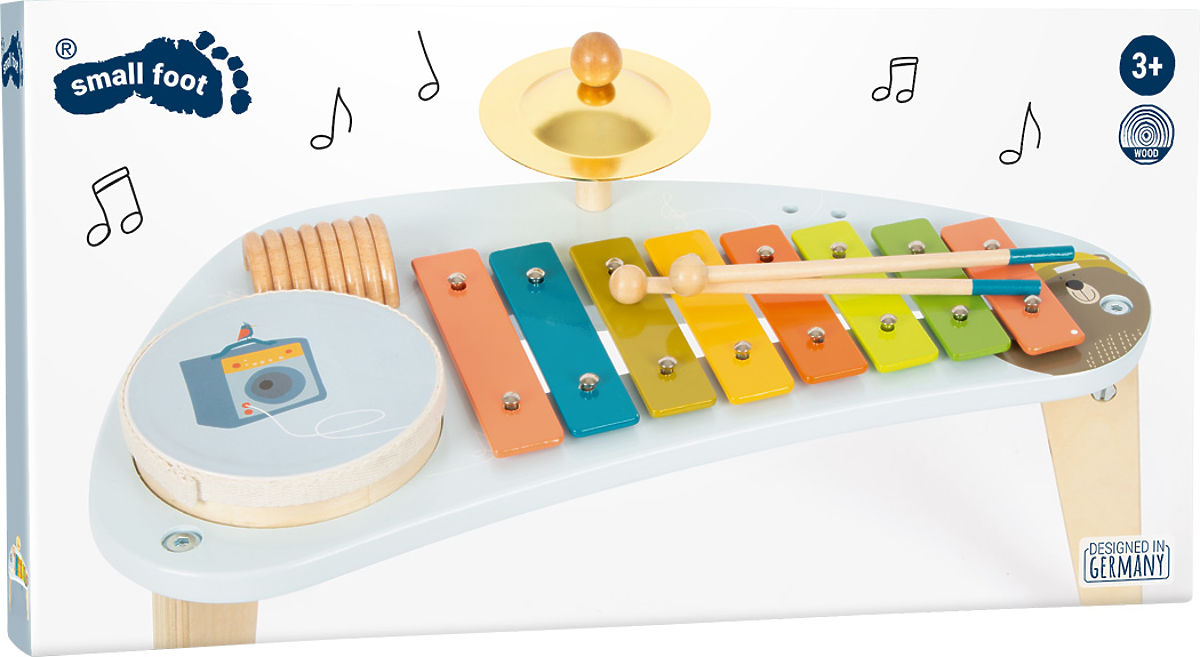 Medveď Bruno vytvára hudbu! Tento robustne skonštruovaný hudobný stolček stojí na troch nohách a povzbudzuje deti, aby hrali na rôzne nástroje a objavovali nové zvuky s činelmi, xylofónom, hrkálkou a odnímateľným bubnom. Klávesy xylofónu sú farebne odlíšené, takže prvé pesničky sú pre deti jednoduché! Dodáva sa s robustnými paličkami z masívneho dreva a notami. Je to množstvo motivujúcej hudby a zábavného učenia! Vizuálne tento hudobný a zvukový stolček vyniká svojím veselým dizajnom a harmonickou kombináciou prírodného dreva a moderných modrých farieb! Okrem nácviku akustického vnímania tento nástroj hravo trénuje aj zmysel pre rytmus, rytmiku a prvé porozumenie hudobným tónom. Hlavné vlastnosti: Rozvíja jemnú motoriku a kreativitu Hravý úvod do sveta zvuku a rytmu Klávesy xylofónu vydávajú odlišné tóny Stolček všetko v jednom