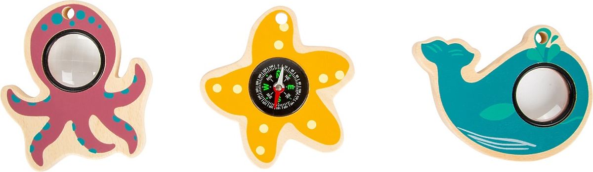 Všetci dobrodruhovia a nadšenci pre oceány pozor! S týmito hračkami budete dobre vybavení na plavbu po mori. Hviezdica s integrovaným kompasom ukáže deťom smer, veľryba im pomôže mať všetko „pod kontrolou“, zatiaľ čo chobotnica ponúkne nový pohľad na vec. Hračky – nástroje majú otvor na šnúrku, deti si ich tak môžu zavesiť okolo krku, alebo ich nosiť vo vrecku.