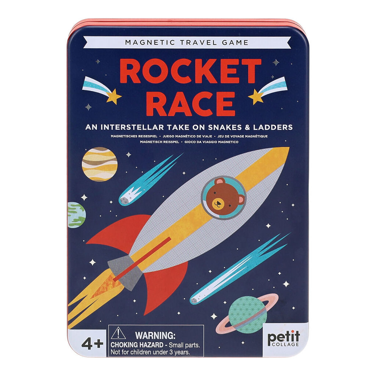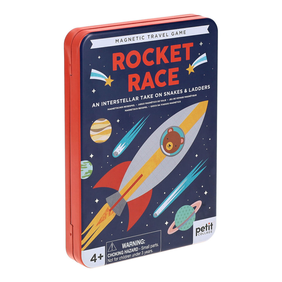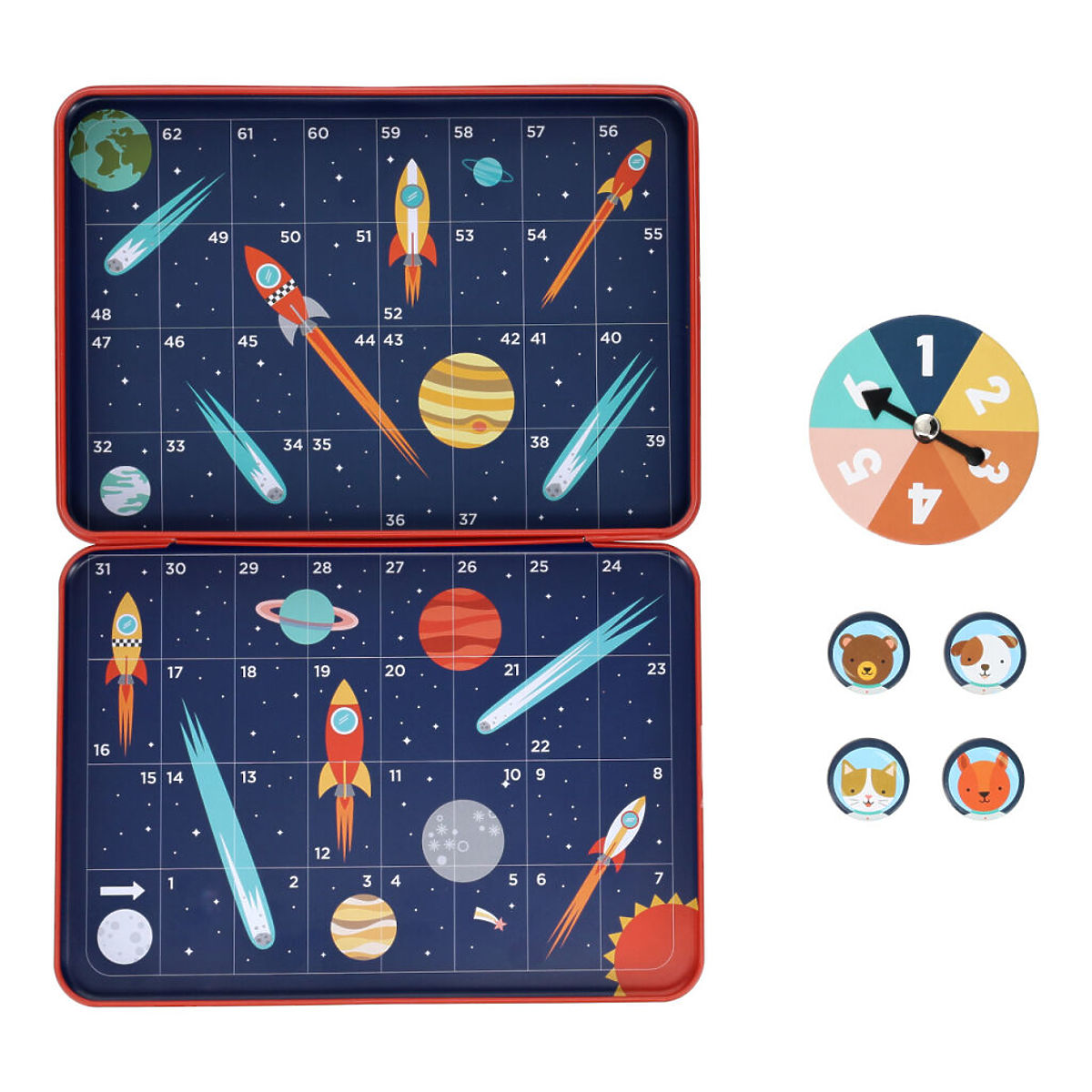 Odštartujte tieto vesmírne preteky! Zábavná hra v kovovej krabičke plná veselých ilustrácií. Hra je vesmírnou verziou Hadov a rebríkov. Striedajte sa v otáčaní kolieska so šípkou, ktoré ukazuje, o koľko polí sa posuniete. Ak sa zastavíte na políčku s horiacim palivom rakety, posuňte sa nahor na telo rakety. Snažte sa vyhnúť chvostu kométy, ak sa na takom poli zastavíte, padáte dole, na jej jadro. Zabalené v recyklovateľnej kovovej krabičke, otváranie na pánty. Po otvorení odhalíte ilustrovanú hraciu dosku, 4 magnetické dieliky, 1 koliesko so šípkou, návod na hru. Vhodné pre 2-4 hráčov od 4 rokov. Hlavné vlastnosti: cestovná magnetická hra, trénuje trpezlivosť, krabička slúži ako hracia plocha