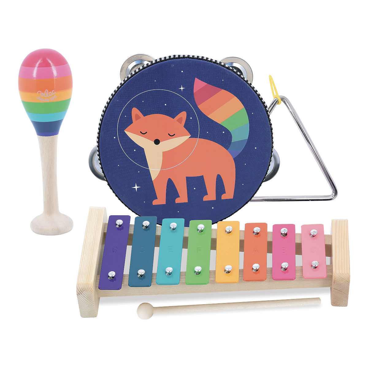 Nech hudba znie! Súprava pestrofarebných perkusných nástrojov zdobených motívmi výtvarníka Andyho Westface. Skladá sa z xylofónu, tamburíny, triangla a maracas. Prostredníctvom nich môžu deti budovať svoj vzťah k hudbe, cit pre rytmus i melódiu. Hrou s nástrojmi možno rozvíjať jemnú motoriku, prehlbovať fantáziu a kreatívne zručnosti. Vďaka kombinácii kovu a dreva sú pevné, odolné a môžu ponúknuť dlhú životnosť. Hlavné vlastnosti: xylofón s paličkou, triangl, tamburína a maracas, dizajn Andy Westface, pevné a odolné prevedenie. Andy Westface je ilustrátor žijúci a pôsobiaci v Hongkongu. Svojou prácou sa snaží sprostredkovať silné pocity a jasné myšlienky za pomoci jednoduchých tvarov, kompozícií i farebnosti. Typickými prvkami jeho diel sú zvieratá a dúha, ktoré si obľúbil pre ich čistotu, úprimnosť a schopnosť vzbudzovať radosť.