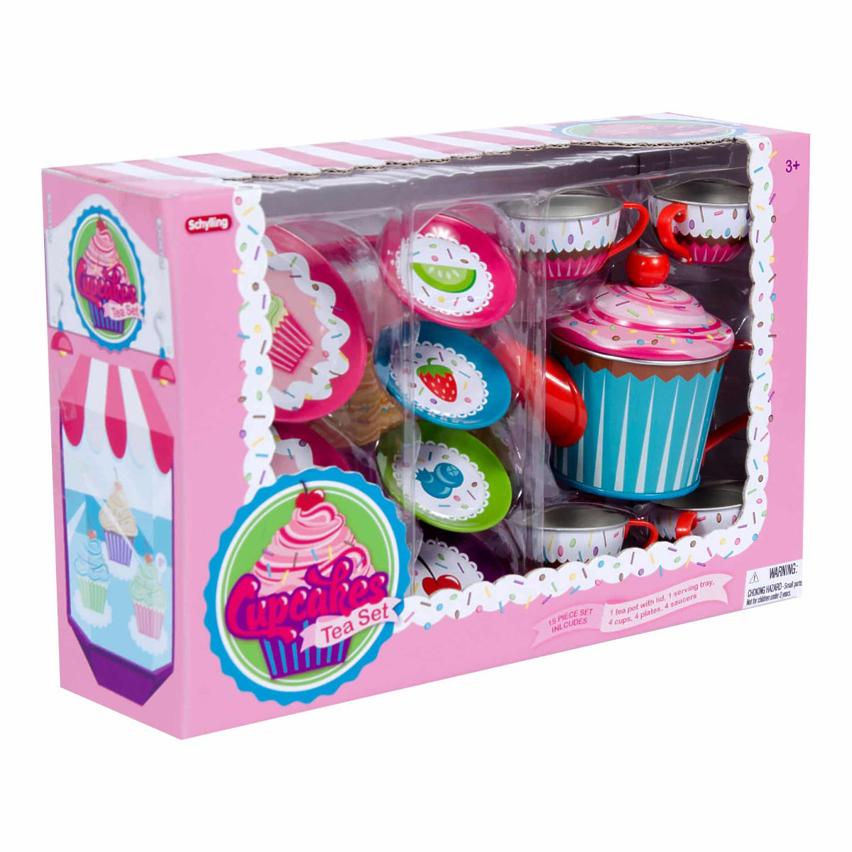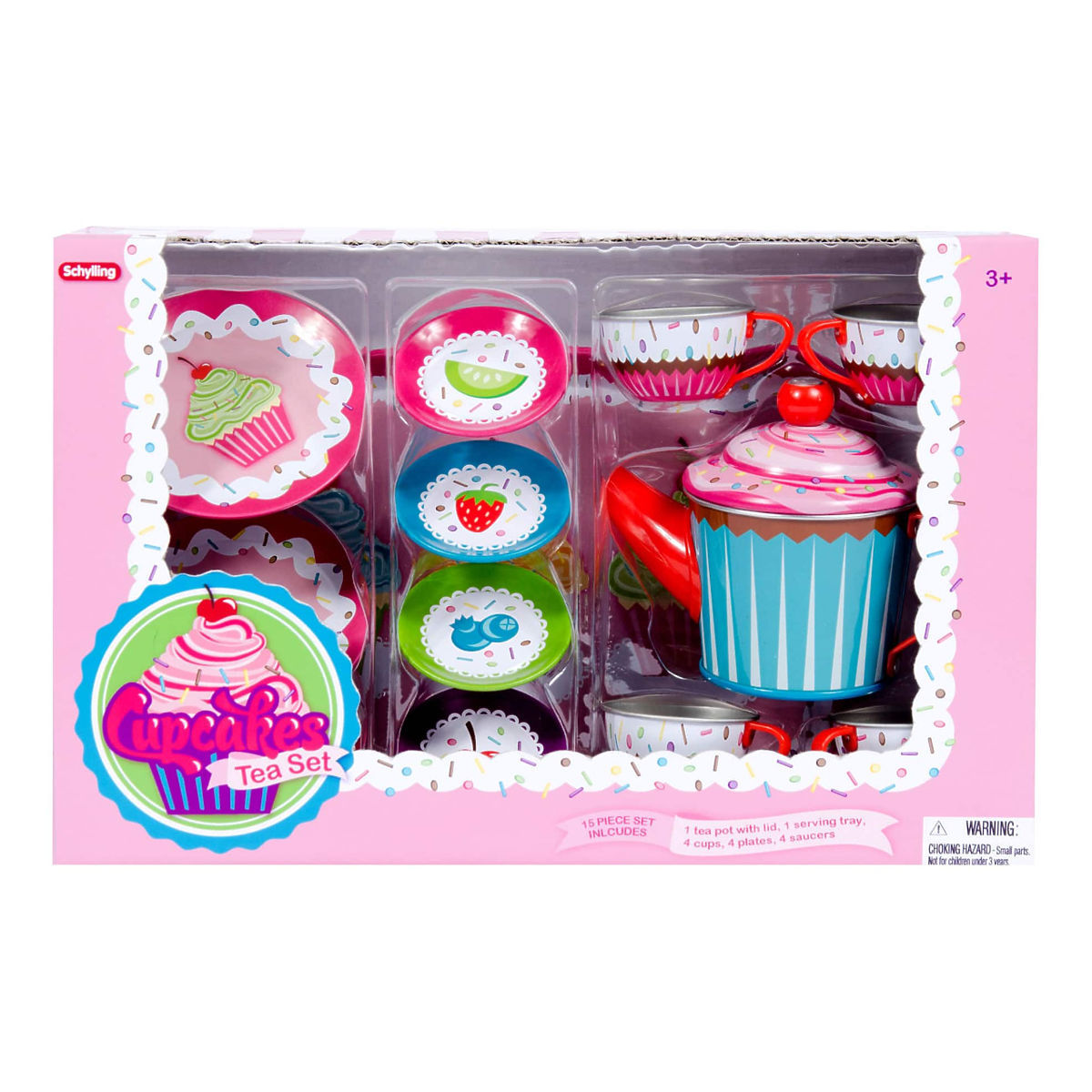 Je čas na čaj. Krásna 15-dielna čajová súprava vyrobená z kovu, obsahuje 4 šálky s podšálkami, 4 dezertné tanieriky, čajník s pokrievkou a servírovací podnos, všetko v dizajne zdobených muffinov. Rozmer servírovacieho podnosu je 24x16 cm. Kreativita stúpa, keď vaše deti hostia kamarátov, bábiky a plyšové hračky s najsladšou čajovou súpravou všetkých čias. Vhodné pre malých hostiteľov a hostiteľky vo veku od 3 rokov. Hlavné vlastnosti: 15-dielna čajová súprava, ideálna pre predstierané čajové posedenia, dizajn s motívom muffinov