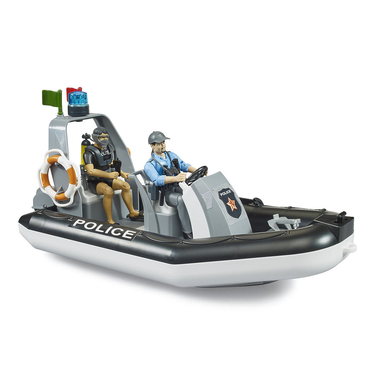 Zákony platia aj na vode! Posilnite a rozšírte možnosti svojho policajného zboru nafukovacím zásahovým člnom. Policajtovi, ktorý má na starosti riadenie a komunikáciu, je vždy k službám špeciálne vycvičený potápač pripravený zasahovať aj v najťažších podmienkach. Čln je vybavený sklopným motorom, kotvou, majákom aj ďalším príslušenstvom na záchranu topiacich sa. Figúrky sú potom vybavené všetkým príslušenstvom nevyhnutným na výkon svojej práce, napríklad ďalekohľadom alebo potápačským nožom. Hračka pláva na vode a je plne prispôsobená na hry vo vonkajších podmienkach. Samozrejmosťou je široká kompatibilita s ponukou modelov a doplnkov BRUDER. Vyrobené v Nemecku, z kvalitných materiálov. Hlavné vlastnosti: pohyblivé a plne vybavené figúrky policajta a potápačaplné vybavenie a na vode plávajúci zásahový člnkompatibilita s BWORLD príslušenstvomvyrobené v Nemecku