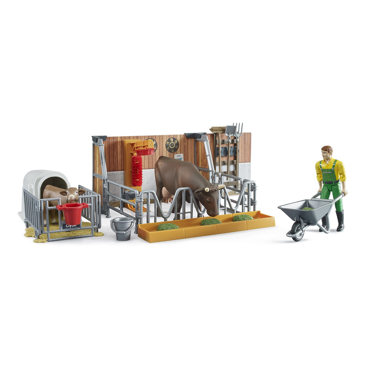 Umožnite deťom stať sa malými farmármi, ktorí neúnavne starajú o hospodárske zvieratá. Na ustajnenie zvierat sada ponúka hneď dva kotce, malý s teliatkom a veľký priestranný kotec s kravou. Tie sú vybavené všetkým potrebným vybavením na napájanie a kŕmenie dobytka, žľabom, napájadlom a kŕmidlom. Pohodlie zvierat pomáha zvyšovať malý prístrešok, masážna kefa a samozrejme aj usilovný hospodár, ktorému je k dispozícii všetko potrebné náradie, od vidiel až po fúrik. Vďaka variabilným stavebnicovým dielom môžu deti stajňu ľahko začleniť medzi ostatné doplnky BWORLD. Mierka je samozrejme prispôsobená tak, aby bolo možné sadu doplniť ľubovoľným z modelov BRUDER, či už ide o traktor, alebo nakladač. Vyrobené v Nemecku, z kvalitných materiálov. Hlavné vlastnosti: pohyblivá figúrka farmára, figúrka kravy a teliatka, 3-dielna obojstranne potlačená kulisa stajne s oplotením a malý kotec s prístreškom, žľab, kŕmidlo a napájadlo, masážne kefy a diel na zavesenie náradia, fúrik, vidly, lopata, kefa a vedro, vyrobené v Nemecku