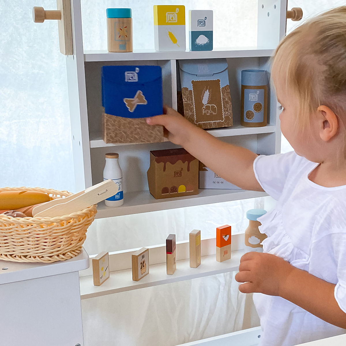 Pre malých maškrtníkov! Tieto štyri sladké pralinky s marshmallow vo vnútri sú vyrobené z dreva a budú sa perfektne hodiť do detských predajných stánkov a kuchyniek. V balení sú štyri varianty: biela čokoláda, tmavá čokoláda, tmavá čokoláda s posýpkou a mliečna čokoláda. Ich prirodzený vzhľad deti nadchne rovnako ako ich eko kartónové balenie. Pralinky s marshmallow vyzerajú ako skutočné a deťom poslúžia pri predstavivej hre na obchod, piknik, čokoládovňu… V kombinácii s ostatnými produktmi z rady „Fresh“ si užijú skutočnú zábavu. Hlavné vlastnosti: štyri čokoládové pralinky z drevabiela čokoláda, horká čokoláda, horká čokoláda s posýpkou, mliečna čokoládarealistický dizajn pre predstavivú hruhygienický kartón, z ktorého možno pralinky jednoducho vybraťkompatibilné s ďalšími produktmi z rady „Fresh“