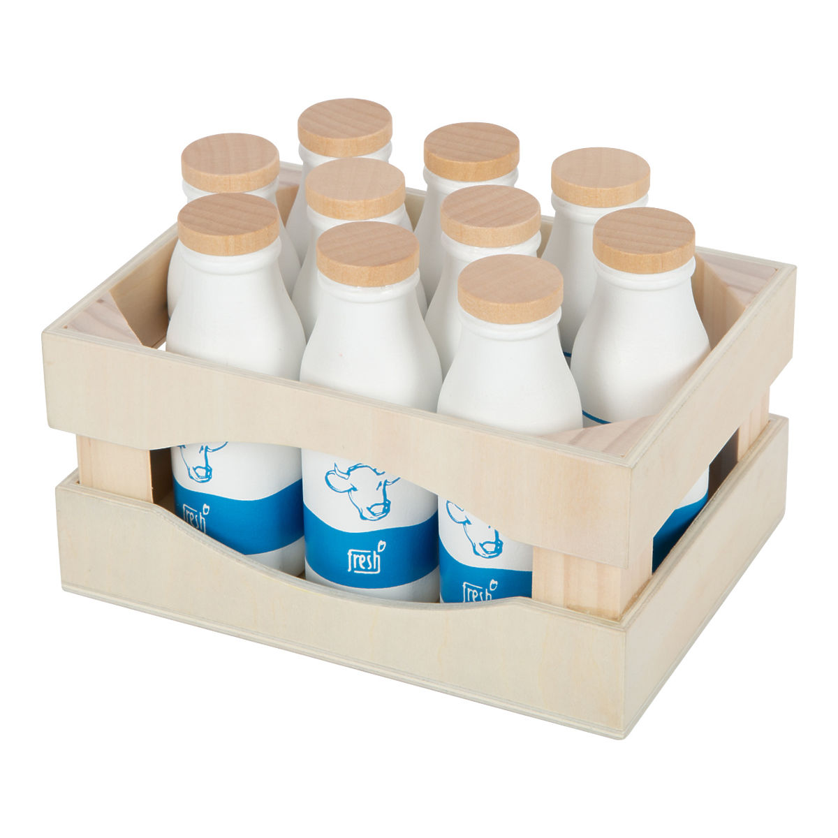 Čo by to bol za detský predajný stánok bez mlieka? Do robustnej prepravky sa zmestí 10 fliaš mlieka, hračka je perfektná pre realistickú hru v kuchynke alebo pri predaji. Vďaka jednoduchým ilustráciám jej ľahko porozumejú aj najmladšie deti. Deti si môžu nakúpiť mlieko v obchodíku a uvariť z neho jedlo. Hračka deti podporí v hraní na role. V kombinácii s ostatnými produktmi z rady „Fresh“ si užijú skutočnú zábavu. Hlavné vlastnosti: robustná drevená prepravka s 10 drevenými fľašami mlieka, ideálny doplnok detských kuchyniek a predajných stánkov, realistická hračka, ktorej jednoducho porozumejú aj najmenšie deti, kompatibilná s ďalšími produktmi z rady „Fresh“