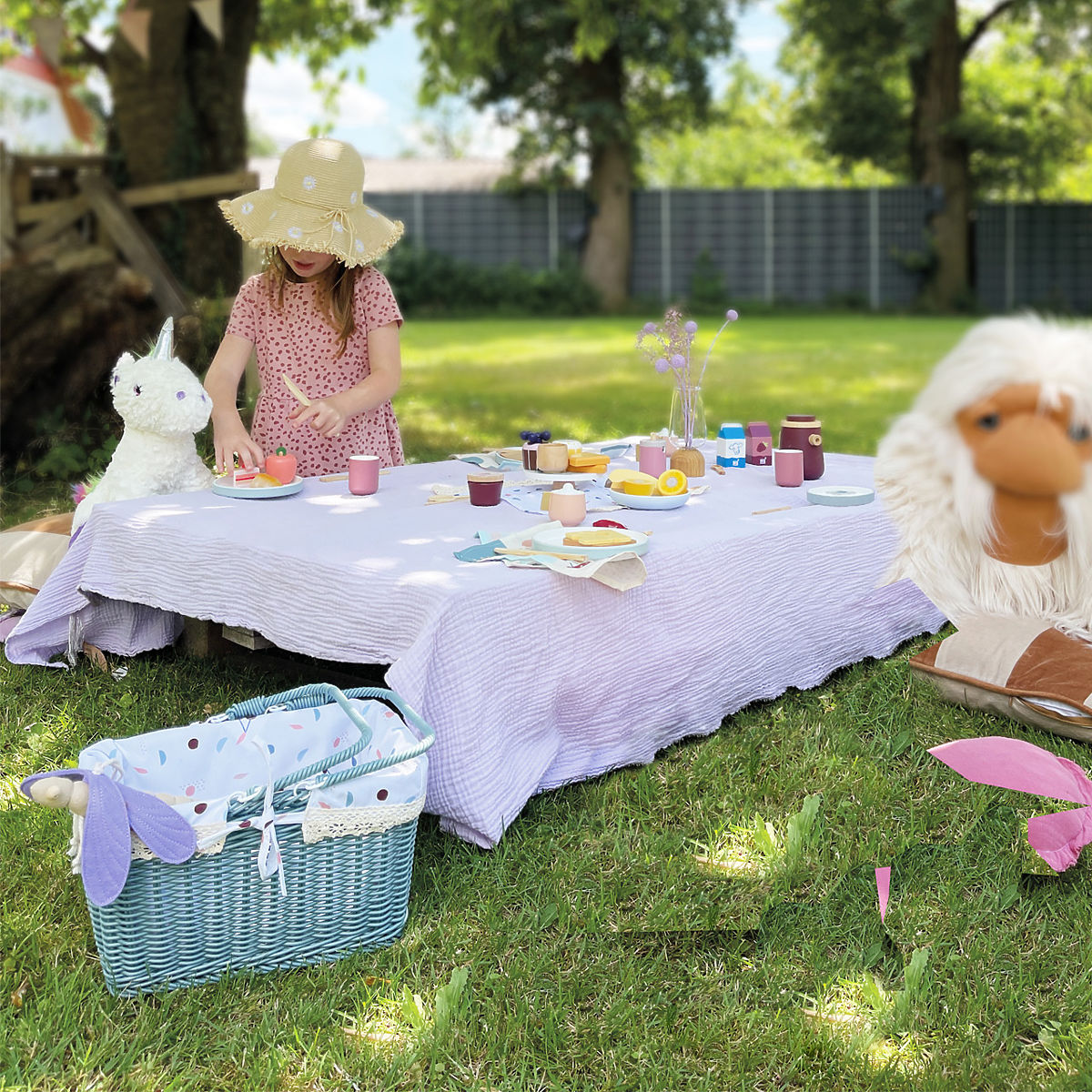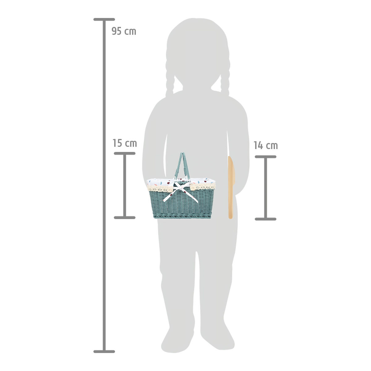 Môžete vyraziť na piknik! Tento kvalitný piknikový kôš so skladacími rukoväťami a piknikovou dekou bude skvelým doplnkom pre vaše výlety na vidiek alebo do záhrady. Košík je upletený z kvalitného prútia, je vybavený pre 2 osoby. Riady a jedlo sú vyrobené z pevného dreva. Pomaranč a croissant držia spolu vďaka suchému zipsu. Vnútorné obloženie košíka je možné vybrať a ľahko vyčistiť. Táto hračka má rovnaké farebné prevedenie ako kuchynka „Tasty“ a ďalšie produkty z tejto série. Deti si s ňou užijú predstavivú hru doma aj vonku. Niektoré z jedál je možné „krájať“ pomocou dreveného noža. Hlavné vlastnosti: moderný a robustný prútený piknikový kôš „jedlo“ pre dve osoby rukoväte je možné zložiť v balení deka v rovnakom motíve vnútorné obloženie je možné jednoducho vybrať hračka na hranie rolí do kuchyniek alebo na piknik pomáha s rozvojom jemnej motoriky, sociálnych a každodenných zručností moderný dizajn v kombinácii s bielou, prírodným drevom a trendy farbami kompatibilný s ďalšími produktmi z rady „Tasty“