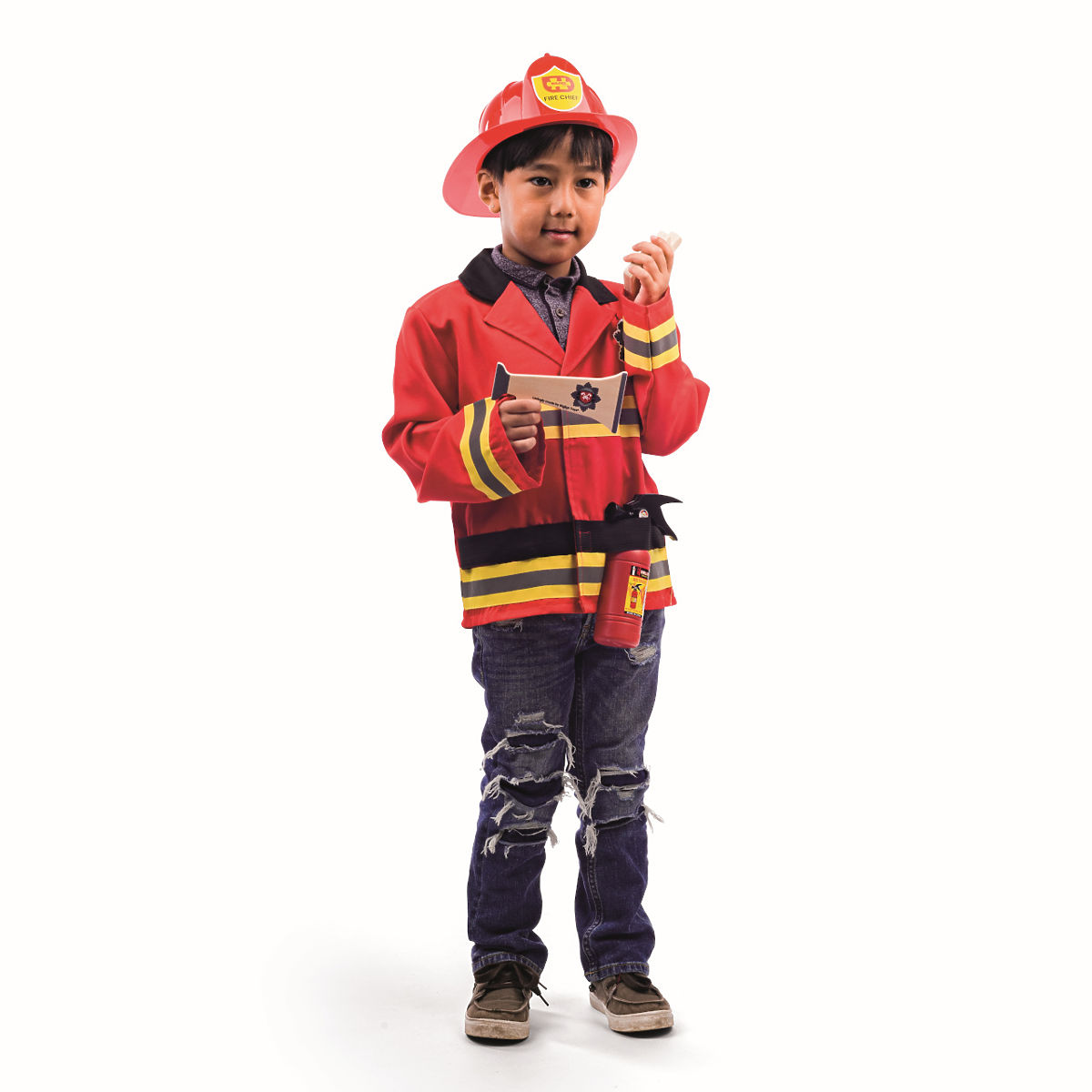Malí hrdinovia môžu prísť na pomoc v tomto detskom kostýme hasiča. Či už ide o hasenie požiarov alebo záchranu mačiek zo stromov, možnosti predstieranej hry sú nekonečné. Súčasťou tejto detskej sady je jasne červená hasičská bunda s pruhovanými rukávmi a odznakom, drevený hasiaci prístroj, vysielačka a megafón. Zapínanie je na suchý zips pre ľahké obliekanie a vyzliekanie. Prilba je nastaviteľná, obvod hlavy 49-55 cm. Kostým bol testovaný podľa najnovších predpisov EN71. Hlavné vlastnosti: vrátane príslušenstva, nastaviteľná prilba, vhodné pre deti od 3 do 5 rokov, nápadité a detailné spracovanie