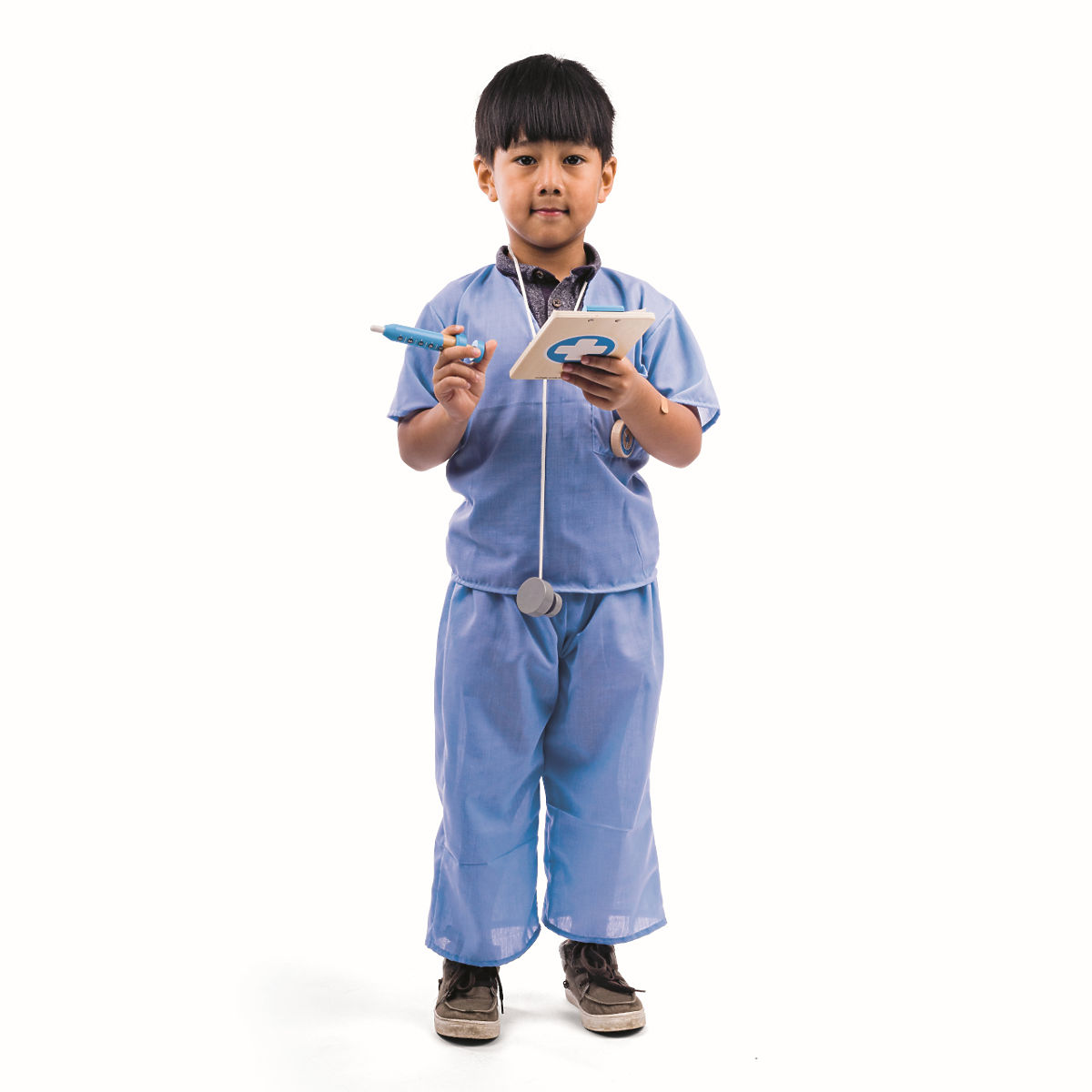 Pomôžte deťom ošetrovať medvedíky, bábiky alebo členov rodiny s týmto realisticky vyzerajúcim kostýmom zdravotníka pre deti. Súčasťou tohto lekárskeho prevleku je modré tričko, nohavice, drevený stetoskop, lekárske dosky, kde si môžu deti zapísať diagnostické poznámky, teplomer, vreckové hodinky a injekčná striekačka a tiež náplasti. Suché zipsy pre ľahké obliekanie a vyzliekanie kostýmu. Kostým je vyrobený z bavlny a polyesteru, možno prať v práčke. Hlavné vlastnosti: ideálny pre ošetrovanie chorých medvedíkov alebo bábik, pomáha s rozvojom predstavivosti, reči a sociálnych zručností, napomáha zmierniť strach a obavy z návštevy lekára